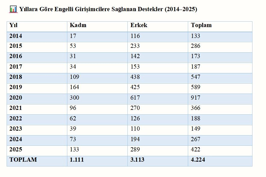 Buna göre; engelli vatandaşlar, kendi işlerini kurmalarına imkan tanıyan hibe programı ile destekleniyor. Engelli ve eski hükümlü çalıştırmayan işverenlerden tahsil edilen idari para cezalarıyla finanse edilen bu programla, kendi işinin patronu olmak isteyen engellilere 580 bin TL'ye kadar hibe desteği sağlanıyor. 2014 yılından bugüne kadar 4 bin 224 engelli girişimci projesi desteklendi. Bu projelerin 1111'i kadın engelliler tarafından hazırlandı. Bu durum engelli kadınların girişimcilik alanındaki artan rolünü gösteriyor.