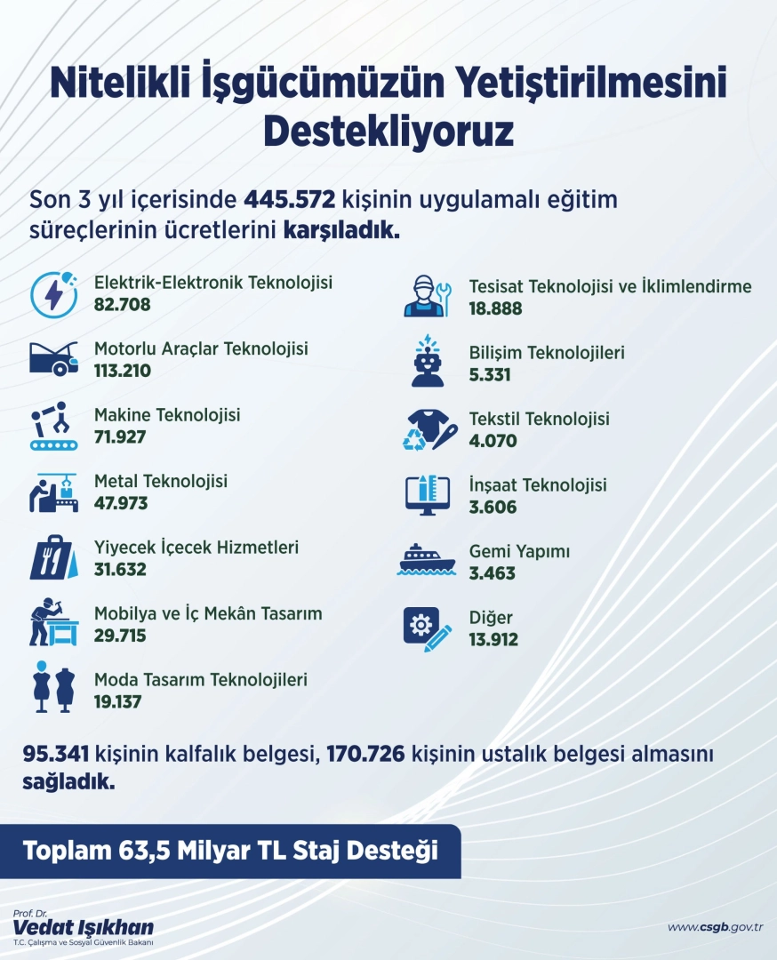 ANKARA, (DHA)- ÇALIŞMA ve Sosyal Güvenlik Bakanı Vedat Işıkhan, "İŞKUR aracılığıyla son 3 yılda 445 bin 572 kişiye 63,5 milyar TL Staj Desteği sağladık" dedi.Çalışma ve Sosyal Güvenlik Bakanı Vedat Işıkhan, sosyal medya hesabından yaptığı açıklamada, "İhtiyaç duyulan stratejik öneme sahip alanlarda nitelikli iş gücümüzü yetiştiriyoruz. İŞKUR aracılığıyla son 3 yılda 445 bin 572 kişiye 63,5 milyar TL Staj Desteği sağladık. Toplamda 95 bin 341 kişinin kalfalık belgesi, 170 bin 726 kişinin ustalık belgesi almasını sağladık. Küresel düzeyde artan rekabet ortamında öne çıkabilmek için çalışma hayatımızı daha da güçlendirmeye ve yenilikçi adımlar atmaya devam edeceğiz. Bu amaçlarla hazırladığımız Ulusal İstihdam Stratejimizi ve Orta Vadeli Program hedeflerimizi gerçekleştireceğiz" dedi. (DHA)