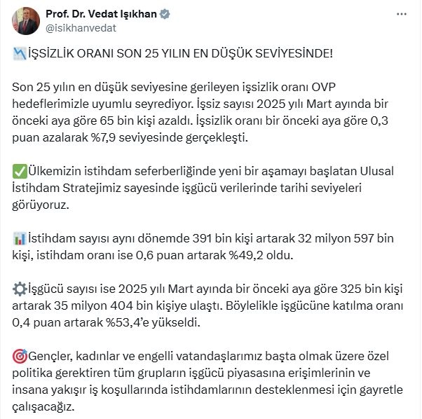 ANKARA, (DHA)- ÇALIŞMA ve Sosyal Güvenlik Bakanı Vedat Işıkhan, "Son 25 yılın en düşük seviyesine gerileyen işsizlik oranı, OVP (Orta Vadeli Program) hedeflerimizle uyumlu seyrediyor" dedi. Çalışma ve Sosyal Güvenlik Bakanı Vedat Işıkhan, mart ayı iş gücü istatistiklerine ilişkin sosyal medya hesabından yaptığı açıklamada, "Son 25 yılın en düşük seviyesine gerileyen işsizlik oranı, OVP hedeflerimizle uyumlu seyrediyor. İşsiz sayısı 2025 yılı Mart ayında bir önceki aya göre 65 bin kişi azaldı. İşsizlik oranı bir önceki aya göre 0,3 puan azalarak yüzde 7,9 seviyesinde gerçekleşti. Ülkemizin istihdam seferberliğinde yeni bir aşamayı başlatan Ulusal İstihdam Stratejimiz sayesinde iş gücü verilerinde tarihi seviyeleri görüyoruz" dedi. 'İŞ GÜCÜNE KATILMA ORANI YÜZDE 53,4'E YÜKSELDİ'İstihdam sayısının aynı dönemde 391 bin kişi artarak 32 milyon 597 bin kişi, istihdam oranının 0,6 puan artarak yüzde 49,2 olduğunu aktaran Işıkhan, "İş gücü sayısı ise 2025 yılı Mart ayında bir önceki aya göre 325 bin kişi artarak 35 milyon 404 bin kişiye ulaştı. Böylelikle iş gücüne katılma oranı 0,4 puan artarak yüzde 53,4'e yükseldi. Gençler, kadınlar ve engelli vatandaşlarımız başta olmak üzere özel politika gerektiren tüm grupların iş gücü piyasasına erişimlerinin ve insana yakışır iş koşullarında istihdamlarının desteklenmesi için gayretle çalışacağız" açıklamasında bulundu. (DHA)
