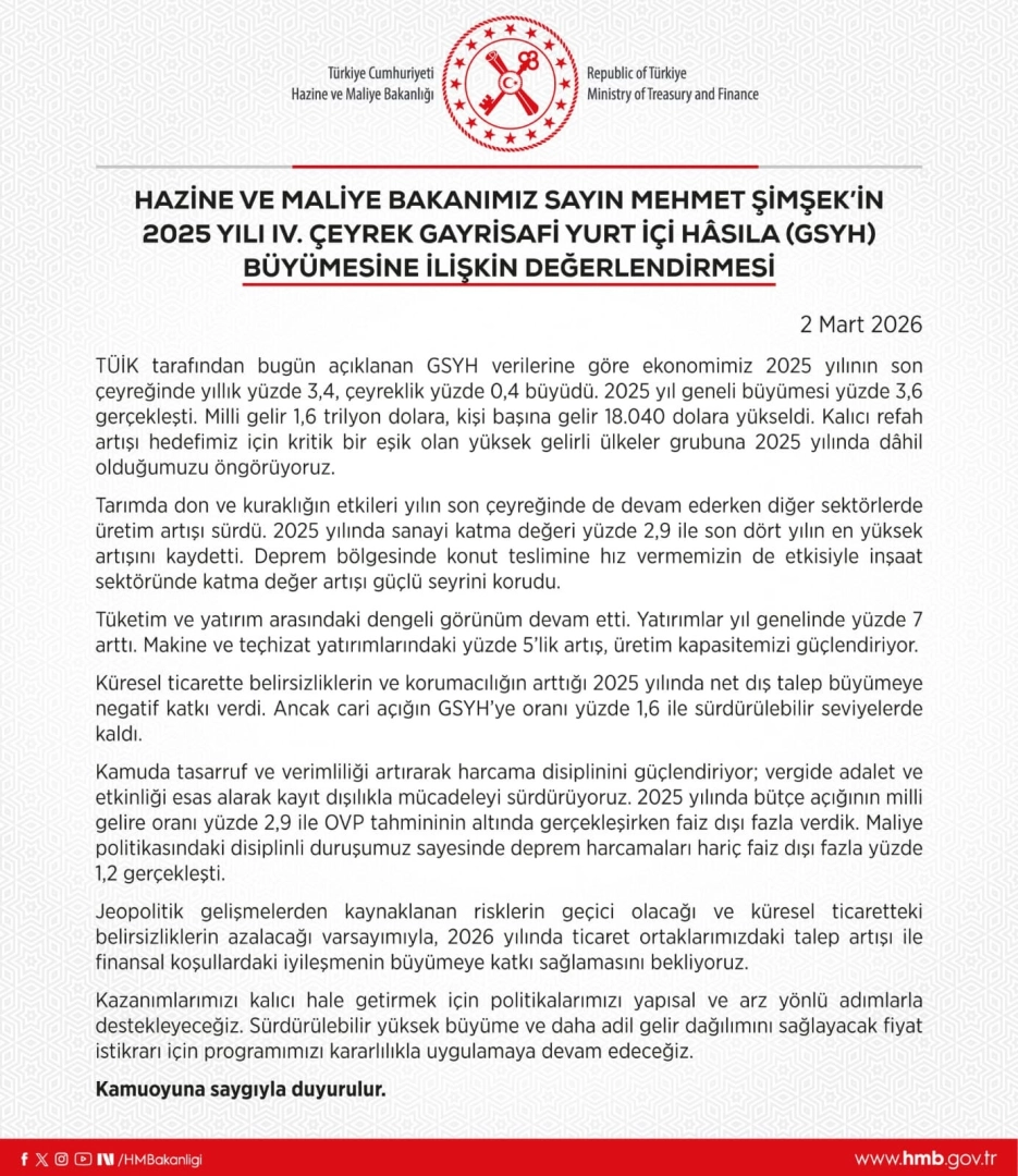 Bakan Şimşek, yaptığı yazılı açıklamada, Türkiye İstatistik Kurumu (TÜİK) tarafından açıklanan 2025 yılına ilişkin Gayrisafi Yurt İçi Hasıla (GSYH) verilerini değerlendirdi. Şimşek, ekonominin 2025 yılının son çeyreğinde yıllık yüzde 3,4, çeyreklik yüzde 0,4 ve geçen yılın genelinde yüzde 3,6 büyüdüğünü belirterek, "Milli gelir 1,6 trilyon dolara, kişi başına gelir 18 bin 40 dolara yükseldi. Kalıcı refah artışı hedefimiz için kritik eşik olan yüksek gelirli ülkeler grubuna 2025 yılında dahil olduğumuzu öngörüyoruz" ifadelerini kullandı.