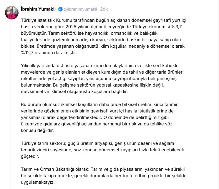 ANKARA, (DHA)- TARIM ve Orman Bakanı İbrahim Yumaklı, 2025 yılı üçüncü çeyrek büyüme verilerine ilişkin, "Türkiye tarımı güçlüdür. Bugün karşılaşılan mevsimsel etkiler geçicidir; tarımsal üretimi artırmak ve altyapımızı güçlendirmeye yönelik azim ve kararlılığımız kalıcıdır" dedi.