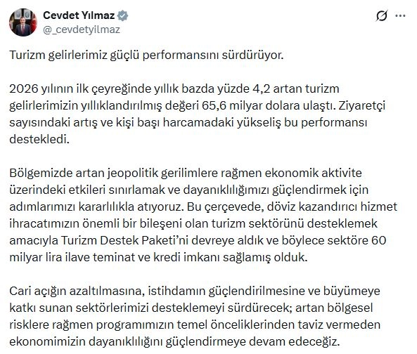 ANKARA, (DHA)- CUMHURBAŞKANI Yardımcısı Cevdet Yılmaz, "Turizm gelirlerimiz güçlü performansını sürdürüyor. 2026 yılının ilk çeyreğinde yıllık bazda yüzde 4,2 artan turizm gelirlerimizin yıllıklandırılmış değeri 65,6 milyar dolara ulaştı" dedi.
