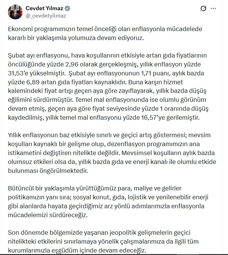 Cevdet Yılmaz, şubat ayı enflasyon verilerine ilişkin sanal medya hesabından açıklama yaptı. Yılmaz, "Ekonomi programımızın temel önceliği olan enflasyonla mücadelede kararlı bir yaklaşımla yolumuza devam ediyoruz. Şubat ayı enflasyonu, hava koşullarının etkisiyle artan gıda fiyatlarının öncülüğünde yüzde 2,96 olarak gerçekleşmiş, yıllık enflasyon yüzde 31,53'e yükselmiştir. Şubat ayı enflasyonunun 1,71 puanı, aylık bazda yüzde 6,89 artan gıda fiyatları kaynaklıdır. Buna karşın hizmet kalemindeki fiyat artışı geçen aya göre zayıflayarak, yıllık bazda düşüş eğilimini sürdürmüştür. Temel mal enflasyonunda ise olumlu görünüm devam etmiş, geçen aya göre fiyat seviyesinde yüzde 1 oranında düşüş kaydedilmiş, yıllık temel mal enflasyonu yüzde 16,57'ye gerilemiştir" dedi.