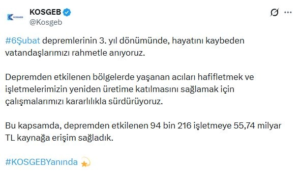 KOSGEB'in sanal medya hesabından yapılan açıklamada, "6 Şubat depremlerinin 3'üncü yıl dönümünde, hayatını kaybeden vatandaşlarımızı rahmetle anıyoruz. Depremden etkilenen bölgelerde yaşanan acıları hafifletmek ve işletmelerimizin yeniden üretime katılmasını sağlamak için çalışmalarımızı kararlılıkla sürdürüyoruz. Bu kapsamda, depremden etkilenen 94 bin 216 işletmeye 55,74 milyar TL kaynağa erişim sağladık" ifadelerini kullandı. (DHA)