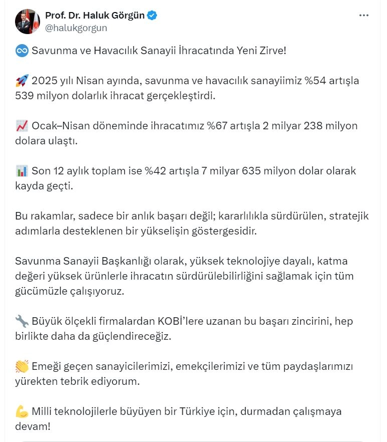 ANKARA, (DHA)- SAVUNMA Sanayii Başkanı Haluk Görgün, savunma ve havacılık sanayi ihracatının nisan ayında yüzde 54 artışla 539 milyon dolar olarak gerçekleştiğini duyurdu.Savunma Sanayii Başkanı Görgün, sosyal medya hesabından yaptığı açıklamada, savunma ve havacılık sanayii ihracatında yeni zirvenin gerçekleştiğini belirterek, "2025 yılı Nisan ayında, savunma ve havacılık sanayiimiz yüzde 54 artışla 539 milyon dolarlık ihracat gerçekleştirdi. Ocak-nisan döneminde ihracatımız yüzde 67 artışla 2 milyar 238 milyon dolara ulaştı. Son 12 aylık toplam ise yüzde 42 artışla 7 milyar 635 milyon dolar olarak kayda geçti. Bu rakamlar, sadece bir anlık başarı değil; kararlılıkla sürdürülen, stratejik adımlarla desteklenen bir yükselişin göstergesidir. Savunma Sanayii Başkanlığı olarak, yüksek teknolojiye dayalı, katma değeri yüksek ürünlerle ihracatın sürdürülebilirliğini sağlamak için tüm gücümüzle çalışıyoruz. Büyük ölçekli firmalardan KOBİ'lere uzanan bu başarı zincirini, hep birlikte daha da güçlendireceğiz. Emeği geçen sanayicilerimizi, emekçilerimizi ve tüm paydaşlarımızı yürekten tebrik ediyorum. Milli teknolojilerle büyüyen bir Türkiye için durmadan çalışmaya devam" ifadelerini kullandı. (DHA)