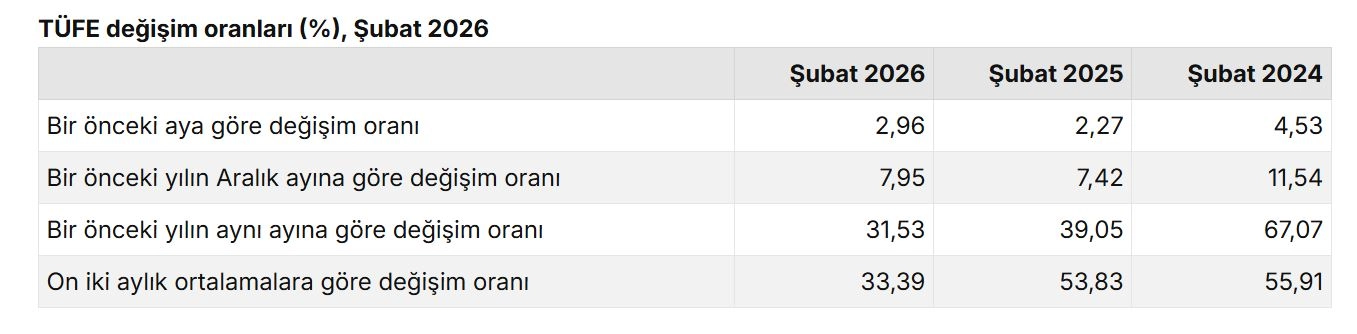 TÜİK, Şubat 2026 dönemine ilişkin enflasyon verilerini açıkladı. Buna göre; tüketici fiyatları şubat ayında bir önceki aya göre yüzde 2,96 artış, bir önceki yılın aralık ayına göre yüzde 7,95 artış, bir önceki yılın aynı ayına göre yüzde 31,53 artış ve 12 aylık ortalamalara göre yüzde 33,39 artış olarak gerçekleşti.