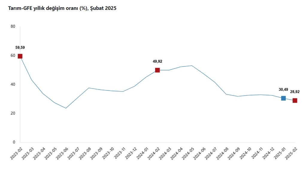 Umutcan ÖREN/ANKARA, (DHA)- TÜRKİYE İstatistik Kurumu (TÜİK), şubat ayında tarımsal girdi fiyatlarının yıllık yüzde 28,92, aylık yüzde 2,35 arttığını açıkladı.TÜİK, Şubat 2025 dönemine ilişkin tarımsal girdi fiyat endeksi verilerini açıkladı. Buna göre; tarımsal girdi fiyatları bir önceki aya göre yüzde 2,35, bir önceki yılın aynı ayına göre yüzde 28,92 ve 12 aylık ortalamalara göre yüzde 37,78 arttı.Ana gruplarda bir önceki aya göre, tarımda kullanılan mal ve hizmetler endeksinde yüzde 2,40 artış, tarımsal yatırıma katkı sağlayan mal ve hizmetler endeksinde yüzde 2,02 artış gerçekleşti. Bir önceki yılın aynı ayına göre tarımda kullanılan mal ve hizmetler endeksinde yüzde 27,49 artış, tarımsal yatırıma katkı sağlayan mal ve hizmetler endeksinde yüzde 37,80 artış gerçekleşti. Yıllık değişimin en yüksek olduğu alt grup yüzde 52,51 artış ile veteriner harcamaları, aylık değişimin en yüksek olduğu alt grup yüzde 3,78 artış ile tohum ve dikim materyali oldu. (DHA)