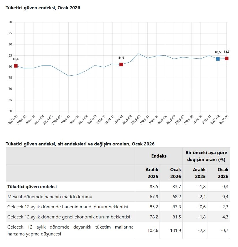TÜİK, Ocak 2026 dönemine ilişkin tüketici güven endeksi verilerini açıkladı. Buna göre; tüketici eğilim anketi sonuçlarından hesaplanan tüketici güven endeksi, ocakta bir önceki aya göre yüzde 0,3 oranında artarak 83,7 oldu. Alt endekslerindeki değişim oranlarına bakıldığında, mevcut dönemde hanenin maddi durumu endeksi yüzde 0,4 artarak 68,2 oldu. Gelecek 12 aylık dönemde hanenin maddi durum beklentisi endeksi yüzde 2,3 azalarak 83,3, gelecek 12 aylık dönemde genel ekonomik durum beklentisi endeksi yüzde 4,3 artarak 81,5 ve gelecek 12 aylık dönemde dayanıklı tüketim mallarına harcama yapma düşüncesi endeksi yüzde 0,7 azalarak 101,9 değerini aldı. (DHA)