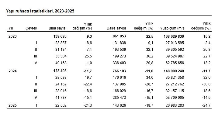 ANKARA, (DHA)- TÜRKİYE İstatistik Kurumu (TÜİK), belediyeler tarafından yapı ruhsatı verilen bina sayısının, ocak-mart döneminde geçen yılın aynı dönemine göre yüzde 21,3 azaldığını açıkladı. TÜİK, 2025 yılı 1'inci çeyreğine ilişkin yapı izin istatistiklerini açıkladı. Bir önceki yılın aynı çeyreğine göre, belediyeler tarafından yapı ruhsatı verilen bina sayısı yüzde 21,3, daire sayısı yüzde 18,7 ve yüz ölçümü yüzde 24,7 azaldı. Yapı ruhsatı verilen yapıların toplam yüz ölçümü 27 milyon metrekare olurken, bunun 14,8 milyon metrekaresi konut, 6,6 milyon metrekaresi konut dışı ve 5,7 milyon metrekaresi ortak kullanım alanı olarak gerçekleşti. Kullanma amacına göre en yüksek pay 18,9 milyon metrekareyle iki ve daha fazla daireli ikamet amaçlı binaların oldu. Bunu 2,1 milyon metrekareyle sanayi binaları ve depolar izledi.YAPI KULLANMA İZİNİ VERİLEN BİNA SAYISI AZALDIBelediyeler tarafından yapı kullanma izini verilen bina sayısı, bir önceki yılın aynı çeyreğine göre yüzde 28, daire sayısı yüzde 25,8 ve yüz ölçümü yüzde 31 azaldı. Bu yapıların toplam yüz ölçümü 25,2 milyon metrekare olurken, bunun 14,1 milyon metrekaresini konut, 5,9 milyon metrekaresini konut dışı ve 5,1 milyon metrekaresini ortak kullanım alanları oluşturdu. Kullanma amacına göre en yüksek pay 18,1 milyon metrekareyle iki ve daha fazla daireli ikamet amaçlı binaların oldu. Bunu 1,9 milyon metrekareyle sanayi binaları ve depolar takip etti. (DHA)