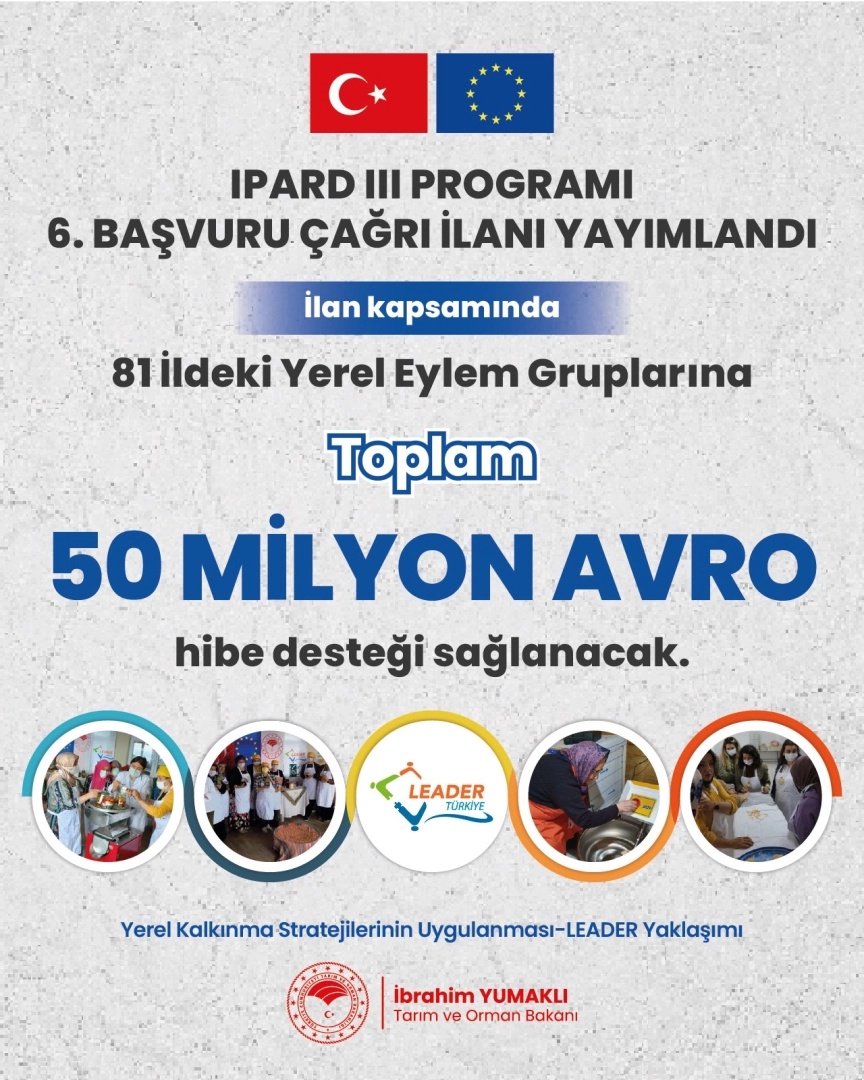 ANKARA, (DHA)- TARIM ve Orman Bakanı İbrahim Yumaklı, 'IPARD 3 Programı 6'ncı Başvuru Çağrı İlanı' kapsamında, çiftçilerden sivil toplum kuruluşlarına, kadınlardan gençlere kadar birçok aktörün bir araya gelerek oluşturduğu Yerel Eylem Gruplarına yüzde 100 hibeli toplam 50 milyon avro destek sağlayacaklarını duyurdu.Tarım ve Kırsal Kalkınmayı Destekleme Kurumu (TKDK) tarafından IPARD III Programı Yerel Kalkınma Stratejilerinin Uygulanması-LEADER Yaklaşımı Tedbiri 6'ncı Başvuru Çağrı İlanı yayımlandı. Bakan Yumaklı, sosyal medya hesabından yaptığı açıklamada, "Kırsalda kadın ve gençlerimiz başta olmak üzere, yerel potansiyeli harekete geçirmek için yenilikçi çözümleri desteklemeye devam ediyoruz. Yerelde çiftçilerden sivil toplum kuruluşlarına, kadınlardan gençlere kadar birçok aktörün bir araya gelerek oluşturduğu Yerel Eylem Grupları aracılığıyla, bölgelerin kalkınması için stratejiler belirleniyor ve uygulanıyor. Böylece kırsaldaki yöre insanı, LEADER yaklaşımı ile birleşip yerelde güçleniyor" dedi. IPARD Programı kapsamında Yerel Eylem Gruplarına bugüne kadar 328 milyon lira hibe desteği sağlandığının altını çizen Bakan Yumaklı, "Bugün itibarıyla, Yerel Kalkınma Stratejilerinin Uygulanması- LEADER Yaklaşımı için 6'ncı Başvuru Çağrı İlanı ile yüzde 100 hibeli olmak üzere toplam 50 milyon avro destek sağlayacağız. Hayırlı, uğurlu olsun" ifadelerini kullandı.BAŞVURULAR 2 HAZİRAN'DA BAŞLIYORTKDK tarafından yapılan yazılı açıklamada ise destek almak amacıyla programa 81 ilden proje başvurusu yapılabileceği belirtildi. Başvurular, 2 Haziran tarihi saat 09.00’dan itibaren projenin uygulanacağı ilde bulunan TKDK İl Koordinatörlükleri ve İl İrtibat Ofislerinde kabul edilmeye başlanacak. Online Proje Başvuru Sistemi 25 Haziran 2025 tarihi saat 18.00’de kapatılacak. Başvuruların son teslim tarihi 27 Haziran olarak belirlendi.Ayrıca yapılan açıklamada, "Alınan başvuruların toplam destek tutarının çağrı için ayrılan bütçeyi aşması durumunda, IPARD Programında ilgili tedbir için belirtilen bütçenin yeterli olduğu sayıda başvuru desteklenecek. Bölgesel denge korunarak, bütçenin dağıtımı yapılacak" denildi. (DHA)