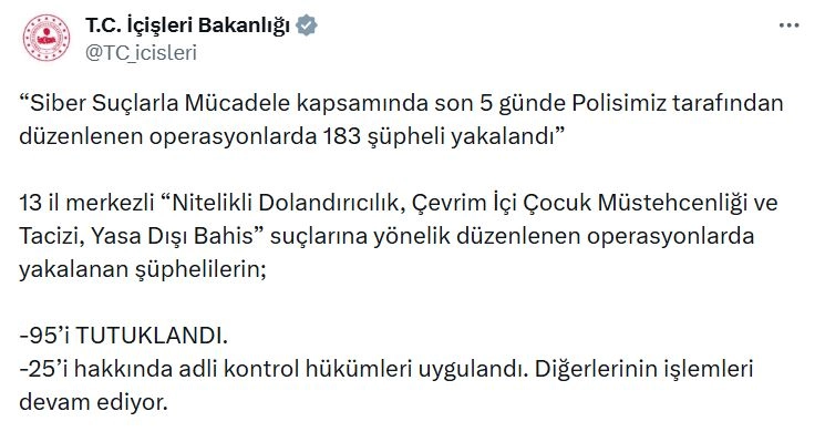 Bakanlığın sanal medya hesabından yapılan açıklamaya göre; Emniyet Genel Müdürlüğü Siber Suçlarla Mücadele Daire Başkanlığı, Mali Suçları Araştırma Kurulu (MASAK) ve Cumhuriyet başsavcılıkları koordinesinde yapılan çalışmalar sonucu; son 5 günde 13 ilde siber suçlara yönelik operasyon düzenlendi. Operasyonlarda 183 şüpheli yakalandı ve 95'i tutuklandı. Şüphelilerden 25'i hakkında adli kontrol hükümleri uygulanırken, diğerlerinin işlemleri devam ediyor.