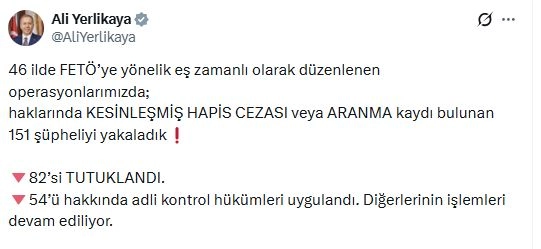 Umutcan ÖREN/ANKARA, (DHA)- İÇİŞLERİ Bakanı Ali Yerlikaya, 46 ilde FETÖ'ye yönelik düzenlenen operasyonlarda gözaltına alınan 151 şüpheliden 82'sinin tutuklandığını duyurdu.