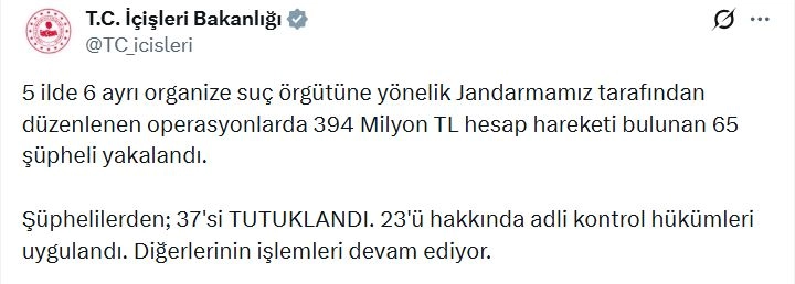 Bakanlığın sanal medya hesabından yapılan açıklamaya göre; jandarma ekipleri, 5 ilde 6 ayrı organize suç örgütüne yönelik operasyon düzenledi. Operasyonlarda, 394 milyon TL hesap hareketi bulunan 65 şüpheli yakalandı. Şüphelilerin adreslerinde çok sayıda dijital materyal, muhtelif miktarda nakit para ve doküman ele geçirildi. Adliyeye sevk edilen şüphelilerden 37'si tutuklandı, 23'ü hakkında adli kontrol hükümleri uygulandı. Diğerlerinin işlemleri ise devam ediyor.