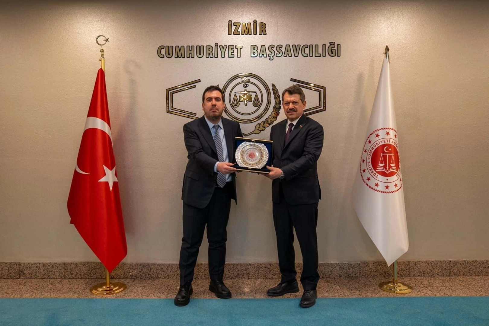 Bakan Yardımcısı Can Tuncay, dün İzmir Adliyesi'ne geldi. İzmir Cumhuriyet Başsavcısı Ali Yeldan tarafından karşılanan Bakan Yardımcısı Tuncay, program çerçevesinde adliye bünyesinde faaliyete alınan Şehit Fethi Sekin Konferans Salonu'nda incelemelerde bulundu. Tuncay, ziyaret sırasında adliyede yürütülen güçlendirme çalışmalarını de yerinde gözlemledi. Bakan Yardımcısı Can Tuncay, tamamlanan ve devam eden projeler hakkında bilgi aldı. Ziyaretin sonunda günün anısına Başsavcı Yeldan, Bakan Yardımcısı Can Tuncay'a plaket takdim etti. (DHA)