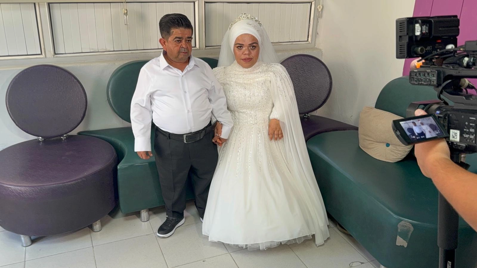 Emek ÇAKILI/YAYLADAĞI (Hatay), (DHA)- HATAY'ın Yayladağı ilçesinde Akondroplazi hastası Mustafa Sevim (48) ve Nurgül Sevim (37) çiftinin maddi imkansızlıklar nedeniyle yapamadığı düğün, yardımlarla gerçekleşti.Yayladağı ilçesinde markette çalışan Akondroplazi hastası Mustafa Sevim, 21 yıl önce tanışıp, aşık olduğu, aynı hastalığa sahip Nurgül Sevim ile 29 Ekim 2024'te resmi nikah kıyılarak dünyaevine girdi. Ancak maddi durumları kötü olan çift, düğün yapamadı. Bunun duyulması üzerine Yayladağı Kaymakamlığı, Yayladağı Belediyesi ve AFAD İl Müdürlüğü devreye girdi. Kamu kurumlarının yardımıyla Nurgül Sevim beyaz gelinliğini, Mustafa Sevim ise damatlığını giyerek hayal ettikleri düğünü gerçekleştirdi. Akondroplazi hastası çift, davullu-zurnalı düğünde doyasıya eğlenip, davetlilerle halay çekti. Yakınları, düğünlerinde çifti yalnız bırakmadı. (DHA)