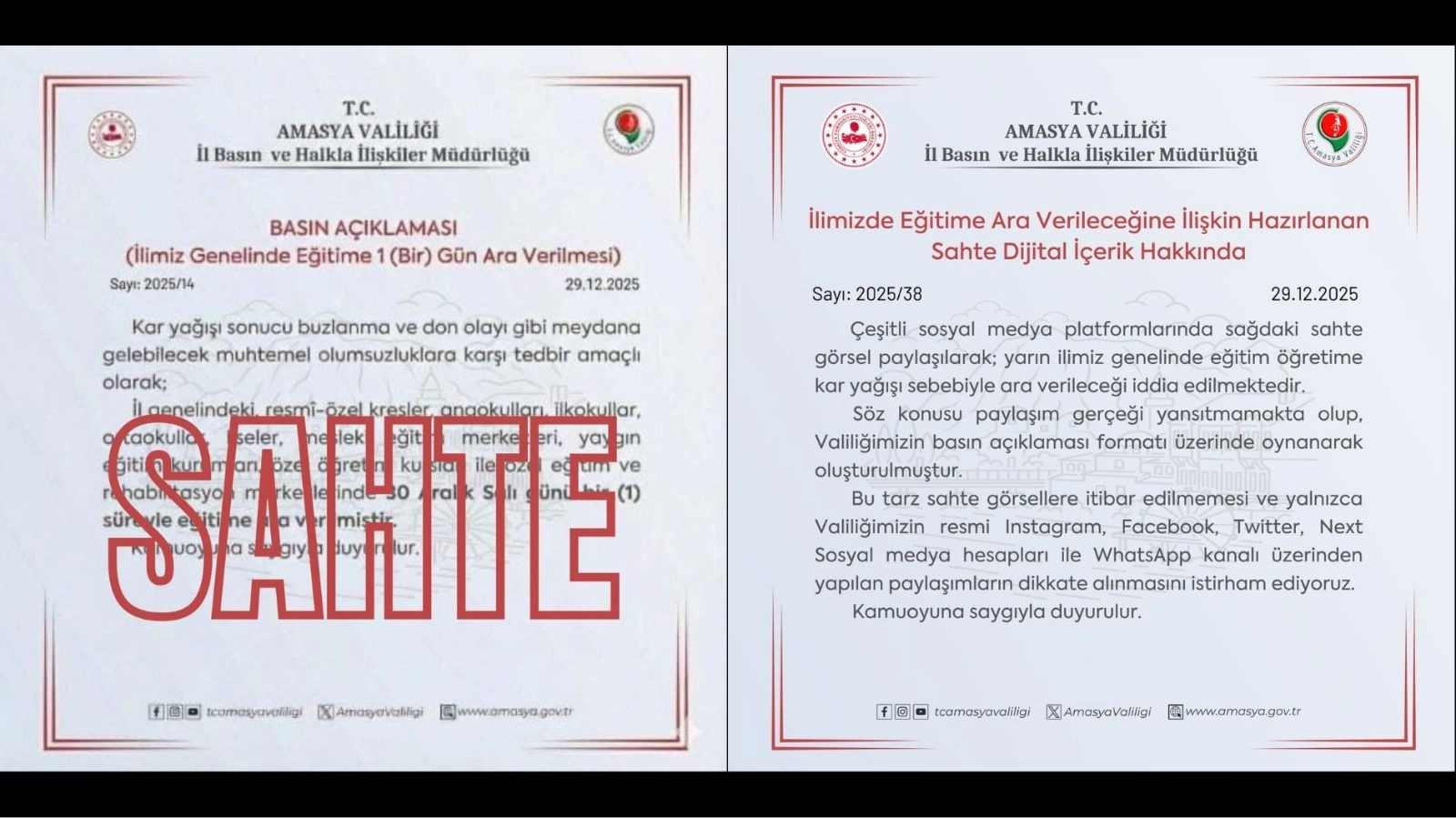 Şerife Serap KARA/AMASYA, (DHA)- AMASYA’da sanal medyada paylaşılan ve eğitime kar tatili verildiğini öne süren sahte görsellere ilişkin Valilik tarafından açıklama yapıldı. Amasya Valiliği, yayılan ‘kar tatili’ duyurularının gerçeği yansıtmadığını belirterek vatandaşları uyardı.