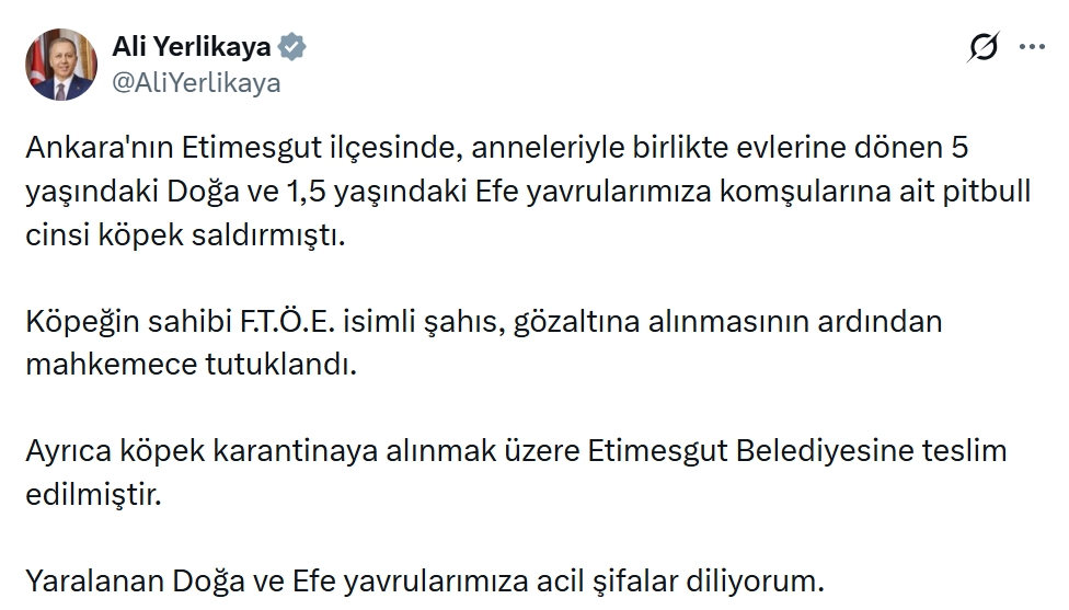 İçişleri Bakanı Ali Yerlikaya da olaya ilişkin sosyal medya hesabından açıklama yaptı. Yerlikaya, "Ankara'nın Etimesgut ilçesinde, anneleriyle birlikte evlerine dönen 5 yaşındaki Doğa ve 1,5 yaşındaki Efe yavrularımıza komşularına ait pitbull cinsi köpek saldırmıştı. Köpeğin sahibi F.T.Ö.E. isimli şahıs, gözaltına alınmasının ardından mahkemece tutuklandı. Ayrıca köpek karantinaya alınmak üzere Etimesgut Belediyesine teslim edilmiştir. Yaralanan Doğa ve Efe yavrularımıza acil şifalar diliyorum" dedi. (DHA)