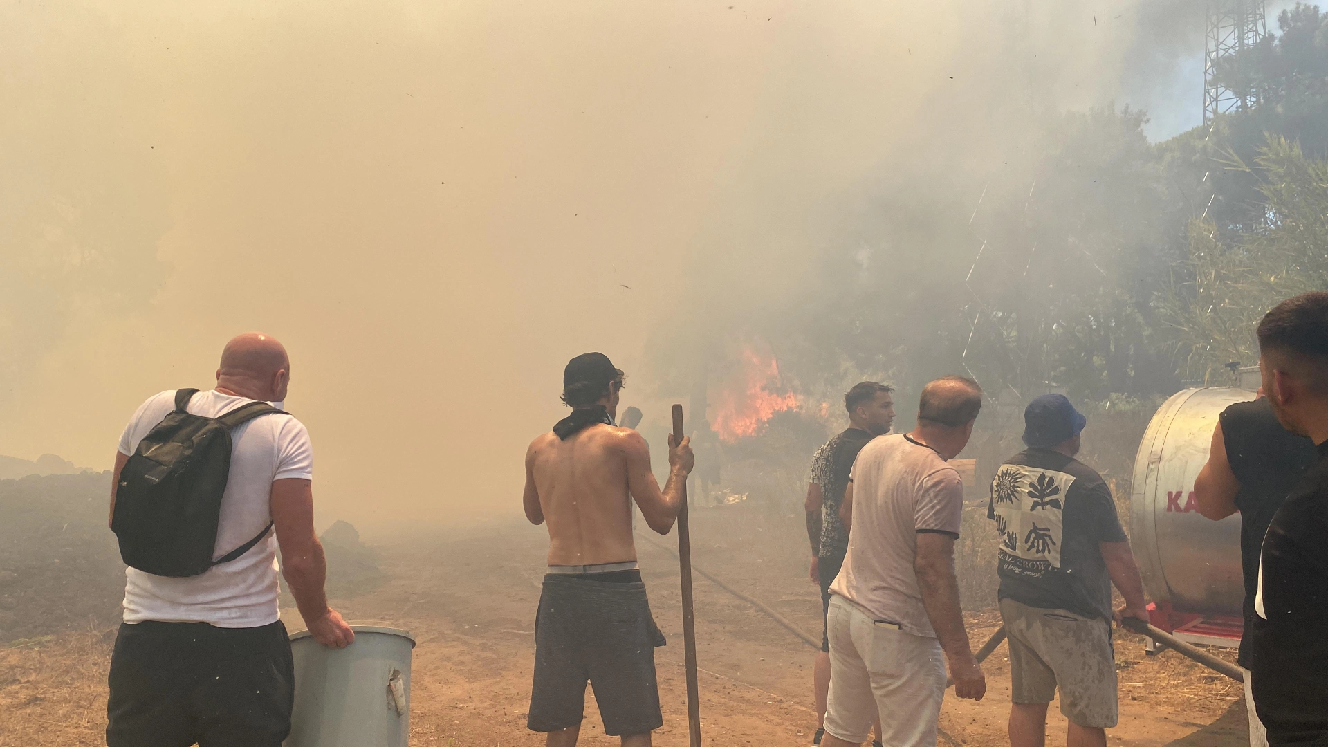 TURİSTLER DE ALEVLERE MÜDAHALE ETTİAntalya'nın Muratpaşa ilçesinde ormanda çıkan yangın, birçok seraya, tarım arazisine ve zeytin ağaçlarına zarar verdi. Ekipler, rüzgar nedeniyle etkisini artıran yangına karadan ve havadan müdahaleyi sürdürüyor. Yangının yakınlardaki bir akaryakıt istasyonuna ulaşmaması için yoğun çaba sarf ediliyor. Vatandaşlar ile bölgedeki otellerde konaklayan, denize girmek için gelen turistler de söndürme çalışmalarına destek veriyor. Bazı turistler kovalara yerdeki su birikintilerini doldurup, alevlere müdahale etti. (DHA)