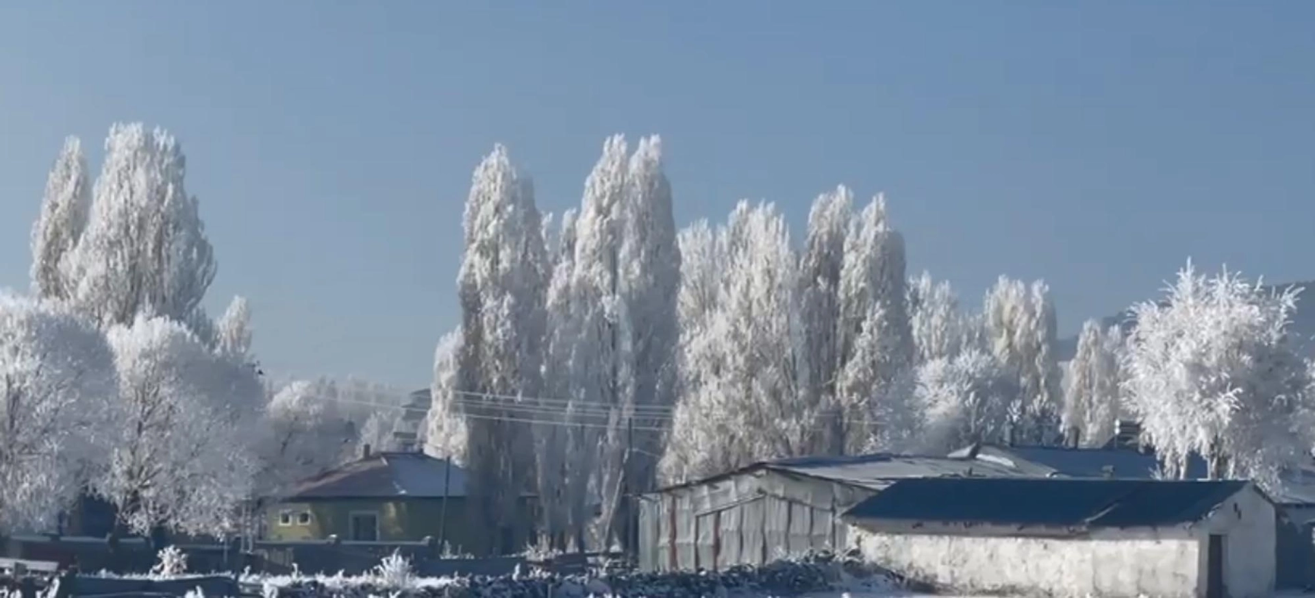 Doğuş Poyraz DURAK/GÖLE (Ardahan), (DHA)- ARDAHAN'ın Göle ilçesi, sıfırın altında 20 dereceyi görürken; ağaçlarda kırağı oluştu, esnaf soğuktan korunmak için halay çekti.
