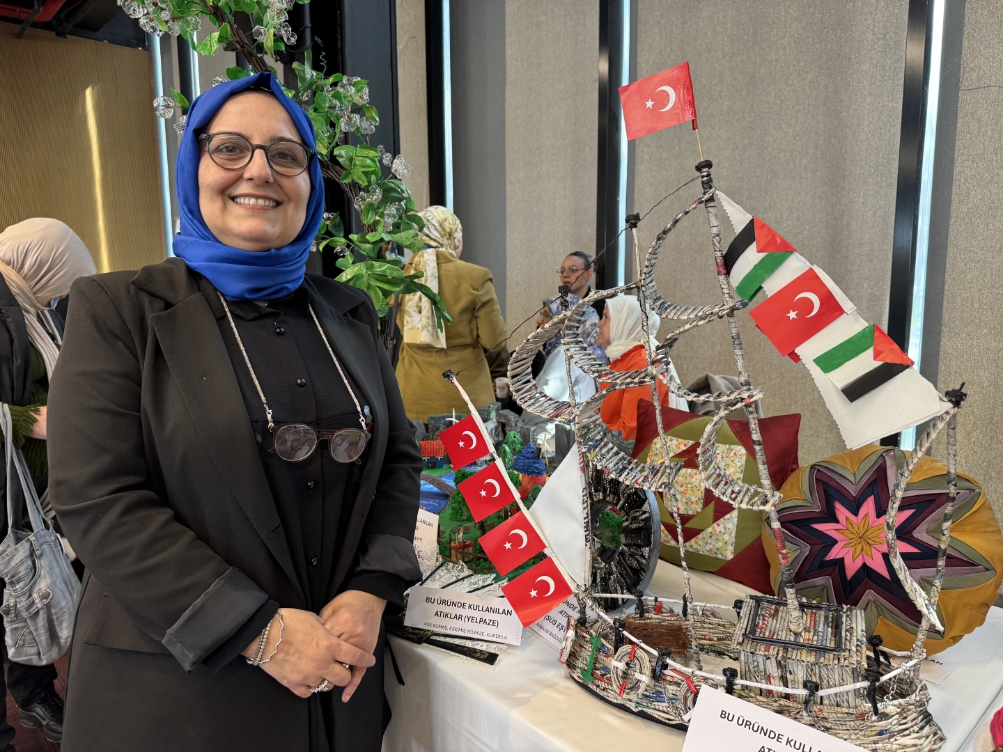 Yıldıray Çınar Kültür Merkezi’nde giyim öğretmenliği yapan Melek Kahraman, atık gazete kağıtları ve elektrik tellerinden Filistin’e giden yardım gemisi Sumud’dan esinlenerek minyatür bir gemi tasarladı. Melek Kahraman, 'Uluslararası Sıfır Atık Günü' kapsamında hazırladığı çalışmayı Samsun Büyükşehir Belediyesi Ömer Halisdemir Çok Amaçlı Salon’da açılan stantta sergiledi. Atık malzemeleri değerlendirip geleceğe daha iyi bir nesil taşımak için bunun gibi olayları çocuklara aşılanması gerektiğini söyleyen Kahraman, “Atıkların doğada çözünmesi çok uzun yıllar alıyor. Plastik ve metal atıkların yok olması 300-400 yılı bulabiliyor. Bu nedenle doğaya zarar vermek yerine bu tür malzemeleri yeniden değerlendirmenin çok daha doğru olduğunu düşünüyorum. Aynı zamanda bu bilinci çocuklarımıza da aşılamamız gerektiğine inanıyorum, atık olarak görülen şeylerin aslında yeniden hayat bulabileceğini onlara göstermemiz gerektiğini düşünüyorum” diye konuştu.