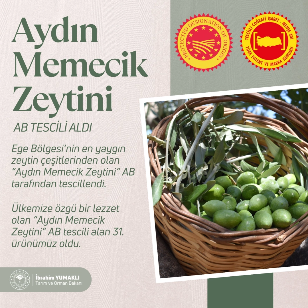 ANKARA, (DHA)- TARIM ve Orman Bakanı İbrahim Yumaklı, Aydın Memecik Zeytini'nin Avrupa Birliği'nden (AB) coğrafi işaret tescili aldığını duyurdu.Bakan Yumaklı, sosyal medya hesabından yaptığı açıklamada, "Anadolu'muzun eşsiz lezzetleri ülke sınırlarını aşmaya devam ediyor. Aydın Memecik Zeytini, AB tarafından coğrafi işaretli ürün olarak tescillenen 31'inci ürünümüz oldu. Coğrafi işaretli ürünlerimiz bölgelerinin bereketli topraklarına bereket katacak. Ülkemize, sektörümüze ve üreticilerimize hayırlı olsun" dedi. (DHA)