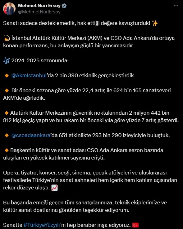 ANKARA, (DHA)- KÜLTÜR ve Turizm Bakanı Mehmet Nuri Ersoy, 2024-2025 sezonunda İstanbul Atatürk Kültür Merkezi'nde (AKM) 2 bin 390 etkinlik, Cumhurbaşkanlığı Senfoni Orkestrası (CSO) Ada Ankara'da 651 etkinlik gerçekleştirildiğini belirterek, "Sanatta Türkiye Yüzyılı'nı hep beraber inşa ediyoruz" dedi.Bakan Ersoy, sosyal medyadan yaptığı paylaşımda, İstanbul AKM ile CSO Ada Ankara'nın 2024-2025 sezonu etkinlik verilerini paylaştı. Ersoy, "Sanatı sadece desteklemedik, hak ettiği değere kavuşturduk. İstanbul AKM ve CSO Ada Ankara'da ortaya konan performans, bu anlayışın güçlü bir yansımasıdır. 2024-2025 sezonunda; İstanbul AKM'de 2 bin 390 etkinlik gerçekleştirdik. Bir önceki sezona göre yüzde 22,4 artış ile 624 bin 165 sanatseveri AKM'de ağırladık. Atatürk Kültür Merkezi'nin güvenlik noktalarından 2 milyon 442 bin 812 kişi geçiş yaptı ve bu rakam bir önceki yıla göre yüzde 7 artış gösterdi. CSO Ada Ankara'da 651 etkinlikte 293 bin 290 izleyiciyle buluştuk. Başkentin kültür ve sanat adası CSO Ada Ankara, sezon bazında ulaşılan en yüksek katılımcı sayısına erişti. Opera, tiyatro, konser, sergi, sinema, çocuk atölyeleri ve uluslararası festivallerle Türkiye'nin sanat sahneleri hem içerik hem katılım açısından rekor düzeye ulaştı. Bu başarıda emeği geçen tüm sanatçılarımıza, teknik ekiplerimize ve kültür sanat dostlarına gönülden teşekkür ediyorum. Sanatta Türkiye Yüzyılı'nı hep beraber inşa ediyoruz" ifadelerini kullandı.614 SİNEMA GÖSTERİMİ GERÇEKLEŞTİRİLDİBakanlıktan yapılan açıklamaya göre; AKM sahnelerinde 2024-2025 sezonu boyunca sahnelenen etkinliklerin çeşitliliği ve yoğunluğu dikkat çekti. AKM'de 48 opera, 35 bale, 201 konser, 140 tiyatro gösterisi ve 143 farklı etkinlikle sanatın her dalı sanatseverlerle buluştu. Sezon boyunca 24 sergi, AKM'de meraklılarını ağırlarken 614 sinema gösterimi gerçekleştirildi. AKM'de yalnızca sahneler değil, çocuklara ayrılan atölyeler de yer aldı. Sezon boyunca 1185 etkinlik AKM'de minik sanatseverleri ağırladı. Sezon boyunca aktif kullanılan diğer alan ise kayıt stüdyosu oldu. AKM'nin kayıt stüdyosunda 112 sanatçıyla 326 saatlik kayıt yapılması, merkezin yalnızca sahne değil, bir üretim alanı olarak da işlev gördüğünü ortaya koydu. (DHA)