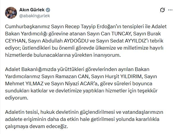 Adalet Bakanı Akın Gürlek, atama kararlarıyla ilgili sanal medya hesabından yaptığı paylaşımda, "Cumhurbaşkanımız Sayın Recep Tayyip Erdoğan'ın tensipleri ile Adalet Bakan Yardımcılığı görevine atanan Sayın Abdullah Aydoğdu, Sayın Burak Ceyhan, Sayın Can Tuncay ve Sayın Sedat Ayyıldız'ı tebrik ediyor; üstlendikleri bu önemli görevde ülkemize ve milletimize hayırlı hizmetlerde bulunacaklarına yürekten inanıyorum. Adalet Bakanlığımızda yürüttükleri görevlerinden ayrılan Bakan Yardımcılarımız Sayın Ramazan Can, Sayın Hurşit Yıldırım, Sayın Mehmet Yılmaz ve Sayın Niyazi Acar'a, görev süreleri boyunca sundukları katkılar ve devletimize yaptıkları hizmetler için teşekkür ediyorum. Adaletin tesisi, hukuk devletinin güçlendirilmesi ve vatandaşlarımızın adalete erişiminin daha da etkin hale getirilmesi yolunda kararlılıkla çalışmaya devam edeceğiz." dedi. (DHA)