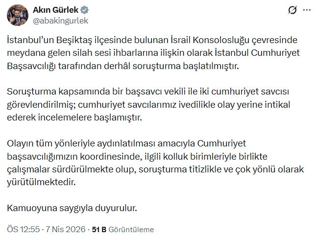 Bakan Gürlek, sanal medya hesabından yaptığı açıklamada, "İstanbul’un Beşiktaş ilçesinde bulunan İsrail Konsolosluğu çevresinde meydana gelen silah sesi ihbarlarına ilişkin olarak İstanbul Cumhuriyet Başsavcılığı tarafından derhal soruşturma başlatılmıştır. Soruşturma kapsamında bir başsavcı vekili ile iki Cumhuriyet savcısı görevlendirilmiş; Cumhuriyet savcılarımız ivedilikle olay yerine intikal ederek incelemelere başlamıştır. Olayın tüm yönleriyle aydınlatılması amacıyla Cumhuriyet başsavcılığımızın koordinesinde, ilgili kolluk birimleriyle birlikte çalışmalar sürdürülmekte olup, soruşturma titizlikle ve çok yönlü olarak yürütülmektedir" ifadelerini kullandı. (DHA)