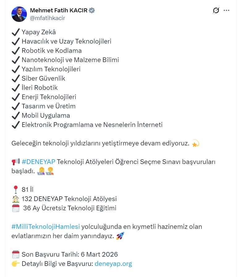 Bakan Kacır, sanal medya hesabından yaptığı açıklamada, "'Yapay Zeka, Havacılık ve Uzay Teknolojileri, Robotik ve Kodlama, Nanoteknoloji ve Malzeme Bilimi, Yazılım Teknolojileri, Siber Güvenlik, İleri Robotik, Enerji Teknolojileri, Tasarım ve Üretim, Mobil Uygulama, Elektronik Programlama ve Nesnelerin İnterneti' alanlarında geleceğin teknoloji yıldızlarını yetiştirmeye devam ediyoruz. 'DENEYAP Teknoloji Atölyeleri' öğrenci seçme sınavı başvuruları başladı. Milli Teknoloji Hamlesi yolculuğunda en kıymetli hazinemiz olan evlatlarımızın her daim yanındayız" dedi. Açıklamada, 81 ilde bulunan 132 DENEYAP Teknoloji Atölyesi'nde verilecek 36 Ay Ücretsiz Teknoloji Eğitimi için başvuruların 6 Mart 2026'da sona ereceği belirtildi. (DHA)