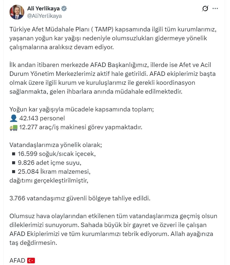 Bakan Yerlikaya, sanal medya hesabından yaptığı açıklamada, "Türkiye Afet Müdahale Planı (TAMP) kapsamında ilgili tüm kurumlarımız, yaşanan yoğun kar yağışı nedeniyle olumsuzlukları gidermeye yönelik çalışmalarına aralıksız devam ediyor. İlk andan itibaren merkezde AFAD Başkanlığımız, illerde ise Afet ve Acil Durum Yönetim Merkezlerimiz aktif hale getirildi. AFAD ekiplerimiz başta olmak üzere ilgili kurum ve kuruluşlarımız ile gerekli koordinasyon sağlanmakta, gelen ihbarlara anında müdahale edilmektedir. Yoğun kar yağışıyla mücadele kapsamında toplam; 42 bin 143 personel, 12 bin 277 araç/iş makinesi görev yapmaktadır" dedi.