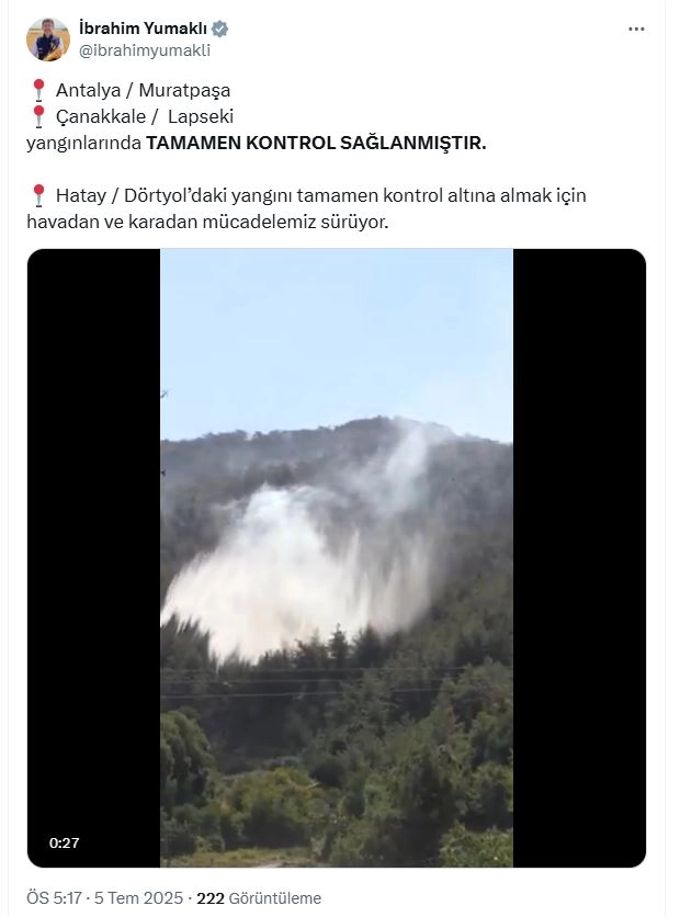 ANKARA, (DHA)- TARIM ve Orman Bakanı İbrahim Yumaklı, Antalya Muratpaşa ve Çanakkale Lapseki'deki yangınların kontrol altına alındığını açıkladı. Tarım ve Orman Bakanı İbrahim Yumaklı, sosyal medya hesabından yaptığı açıklamada, "Antalya Muratpaşa, Çanakkale Lapseki yangınlarında tamamen kontrol sağlanmıştır. Hatay Dörtyol'daki yangını tamamen kontrol altına almak için havadan ve karadan mücadelemiz sürüyor" dedi. (DHA)