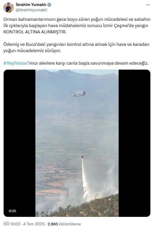 ANKARA, (DHA)- TARIM ve Orman Bakanı İbrahim Yumaklı, "İzmir Çeşme'de yangın kontrol altına alınmıştır" dedi.Tarım ve Orman Bakanı İbrahim Yumaklı, sosyal medya hesabından yaptığı açıklamada, "Orman kahramanlarımızın gece boyu süren yoğun mücadelesi ve sabahın ilk ışıklarıyla başlayan hava müdahalemiz sonucu İzmir Çeşme'de yangın kontrol altına alınmıştır. Ödemiş ve Buca'daki yangınları kontrol altına almak için hava ve karadan yoğun mücadelemiz sürüyor. Yeşil vatanımızı alevlere karşı canla başla savunmaya devam edeceğiz" dedi. (DHA)