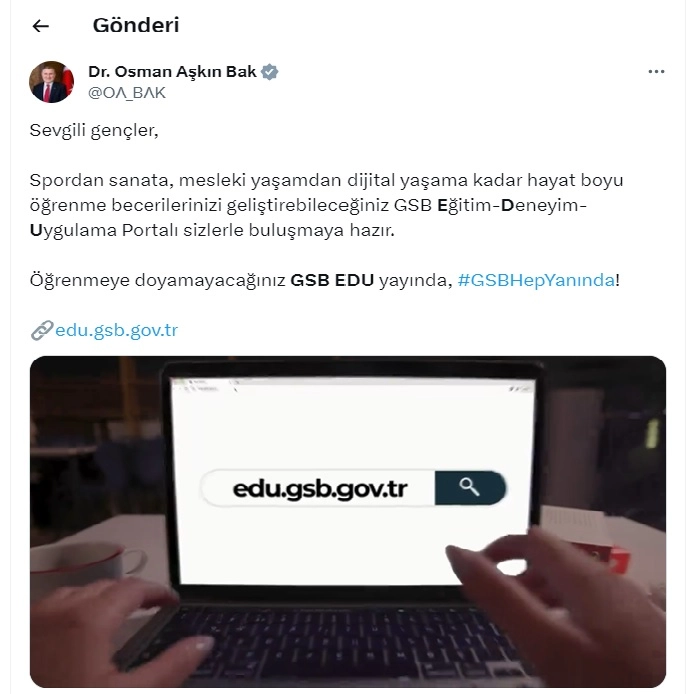 ANKARA, (DHA)- GENÇLİK ve Spor Bakanlığı'nın (GSB), gençlere yönelik ücretsiz eğitimlerinin yer aldığı GSB Eğitim-Deneyim-Uygulama (EDU) projesi hayata geçirildi. Bakanlıktan yapılan açıklamaya göre; gençlerin eğitim ve kariyer gelişimine katkı sağlayacak projede, spor eğitim kurslarının yanı sıra kültür sanat, bilim teknoloji, mesleki yetkinlik ve yabancı dil gibi pek çok eğitim kategorisi yer alıyor. Gençler, proje detaylarına ve eğitimlere edu.gsb.gov.tr adresinden ulaşabilecek. Eğitimlerin ücretsiz olarak sunulacağı proje kapsamında, bakanlığa bağlı tüm tesisler birer eğitim birimine dönüştürüldü. Spor ve gençlik kategorilerinde 475 eğitim içeriği, 81 ilde 7 binden fazla eğitmen ve antrenör ile yüz yüze sunulacak. Eğitimler, gençlik merkezleri, GSB yurtları ve spor tesislerinde verilecek. Eğitimleri tamamlayan katılımcılar, bakanlık onaylı sertifikalara sahip olacak. Uzaktan ve dijital eğitimlere edu.gsb.gov.tr adresinden ulaşılabileceği gibi Birol Güven, Altan Erkekli, Pelin Çift, Nevzat Tarhan, Uğur Derman ve Erol Parlak gibi mentörlerin, hayat deneyimleri ile tecrübelerini paylaştığı 7 ila 10 haftalık ders programını içeren videolu eğitimlerine, 'Mentorüm Hayat Becerileri Programı'ndan ücretsiz olarak erişilebilecek. Videolu eğitimlerin sonunda da gençler, katılım belgesi alabilecek. Uzaktan eğitim portalında yer alan 3-5 dakikalık, risk yönetimi, duygu yönetimi, zaman yönetimi, dijital okuryazarlık, analitik düşünme gibi 42 başlık altında bulunan mikro öğrenme videoları ile kariyer yaşamını ve günlük hayatı kolaylaştıracak yüzlerce kişisel gelişim eğitimleri de erişime açıldı. BAKAN BAK'TAN AÇIKLAMA Gençlik ve Spor Bakanı Osman Aşkın Bak, sosyal medya hesabından yaptığı açıklamada, "Sevgili gençler, spordan sanata, mesleki yaşamdan dijital yaşama kadar hayat boyu öğrenme becerilerinizi geliştirebileceğiniz GSB EDU portalı sizlerle buluşmaya hazır. Öğrenmeye doyamayacağınız GSB EDU yayında, GSB hep yanında" ifadelerini kullandı. (DHA)