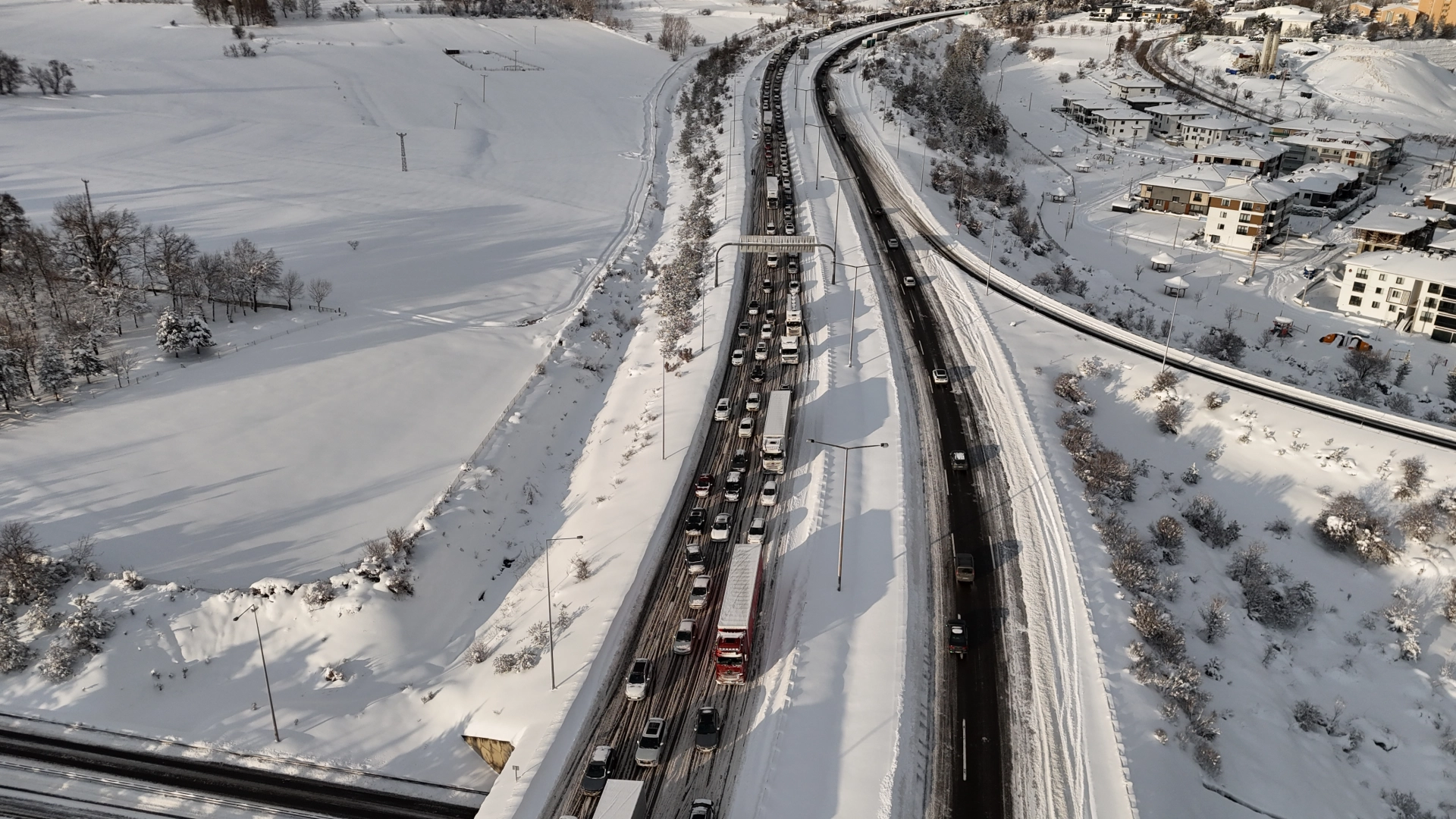 Bolu’da Anadolu Otoyolu'nun ağır tonajlı araçlara yeniden açılmasının ardından güzergahlar üzerinde yığılmalar oldu. Otoyolda oluşan uzun araç kuyrukları dronla görüntülendi. (DHA)