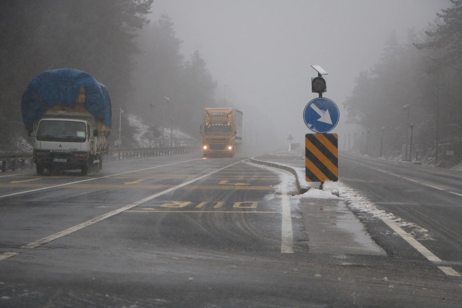 Mutlu YUCA-Zübeyde ÖZMEN/BOLU,(DHA)-BOLU Dağı'nın D-100 kara yolu geçişinde hafif kar yağışı ve sis etkili oldu.