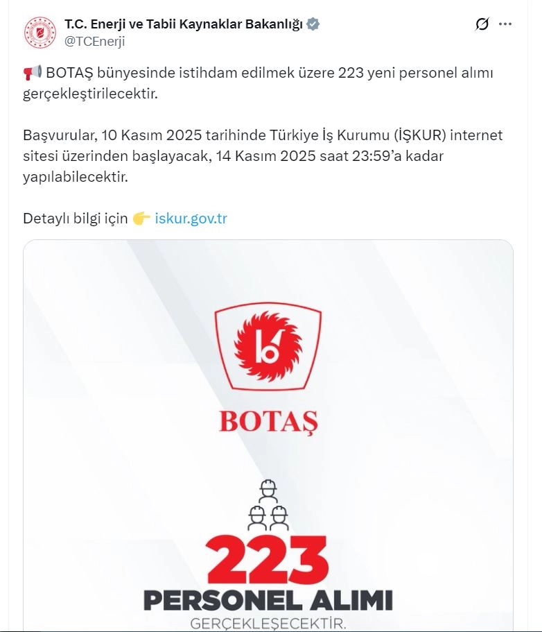 Bakanlığın sosyal medya hesabından yapılan açıklamada, "BOTAŞ bünyesinde istihdam edilmek üzere 223 yeni personel alımı gerçekleştirilecektir. Başvurular, 10 Kasım 2025 tarihinde Türkiye İş Kurumu (İŞKUR) internet sitesi üzerinden başlayacak, 14 Kasım 2025 saat 23.59'a kadar yapılabilecektir" denildi. (DHA)