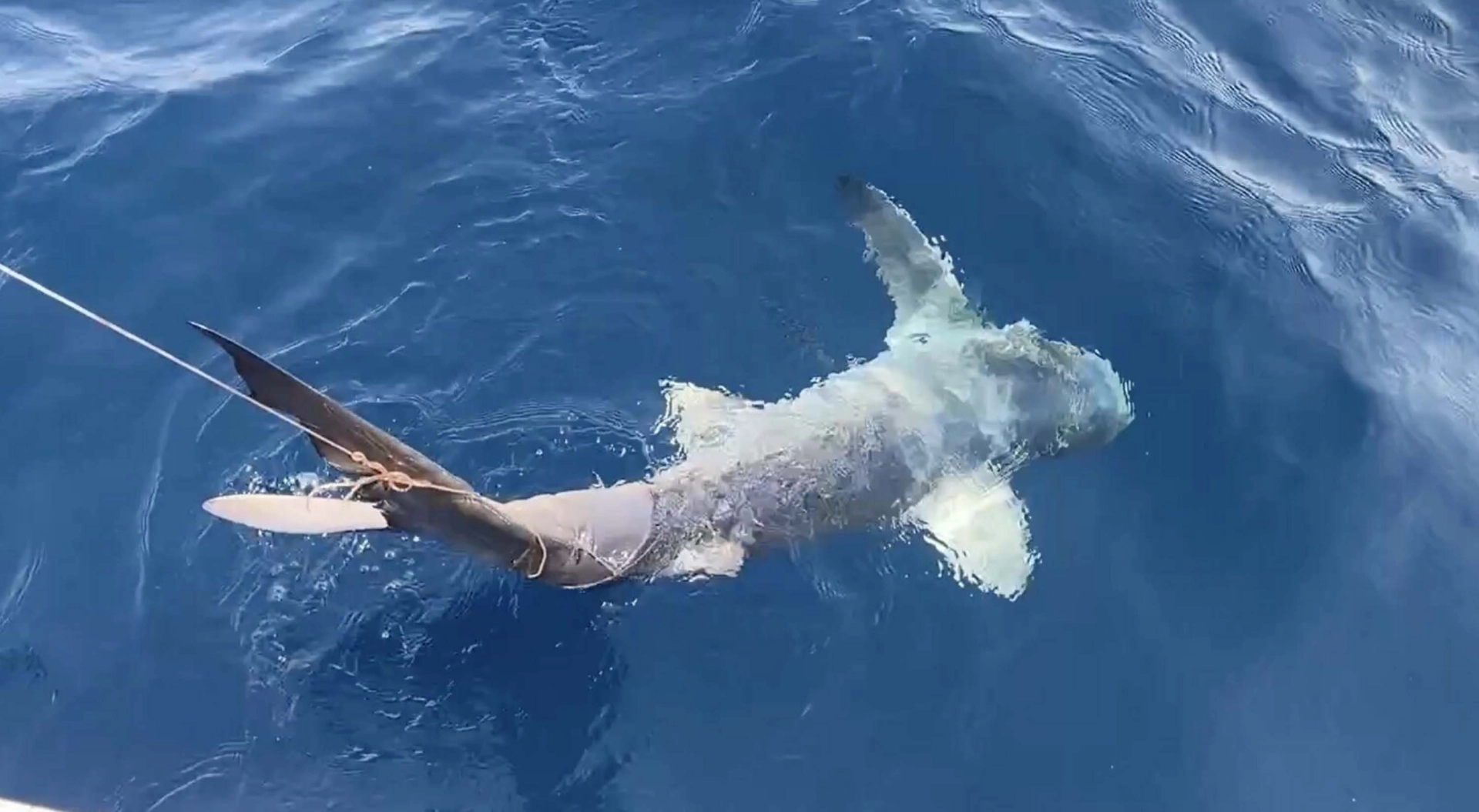 Vural BOZOK/GÖKÇEADA,(Çanakkale), (DHA)-ÇANAKKALE'nin Gökçeada ilçesinde paraketa oltasına dolanmış halde bulunan nesli tükenme tehlikesindeki 'mako' cinsi köpek balığı, kurtarılarak yeniden suya bırakıldı.Gökçeada'da balıkçılık yapan İlker Özdemir ve arkadaşı önceki gün balık avlamak için teknesiyle denize açıldı. İkili, Kaleköy Limanı açıklarında hareketsiz halde bir balık olduğunu fark etti. Balığa yaklaşan Özdemir, paraketa oltasına dolanan balığın avlanması yasak olan, 3 metre boyunda ve 500 kilogram ağırlığında 'mako' cinsi köpek balığı olduğunu fark etti. Özdemir, 'mako' cinsi köpek balığını sudan çıkardığı anları, cep telefonuyla kaydetti. Özdemir ve arkadaşı, köpek balığını dolandığı oltadan kurtararak yeniden suya bıraktı.'KÖPEK BALIKLARI, KIYILARA GELEBİLİYOR'İlk kez böyle bir türle karşılaştığını söyleyen balıkçı İlker Özdemir, "Misinalar balığı boğmuş. Demek ki bu hayvan, bu kadar sığ kıyılarda geziyor. Yaklaşık 40 metre derinlikteki sularda dünyanın en vahşi köpek balıklarından mako cinsi, devasa bir balık. Köpek balıkları, kıyılara gelebiliyor. Bunlar, vahşi hayvanlar. Hayatımda ilk defa bu tür bir balığı kıyıda gördüm. Plajlara gelip, gelmeyeceğini bilmiyorum ama dikkatli olalım" diye konuştu.(DHA)
