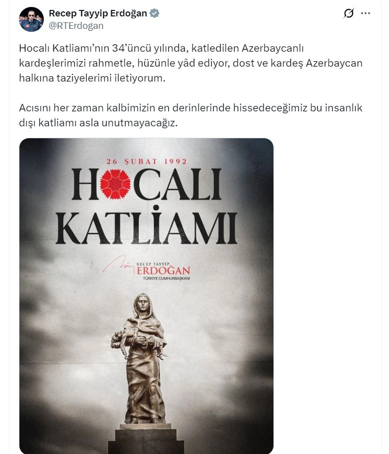 ANKARA, (DHA)- CUMHURBAŞKANI Recep Tayyip Erdoğan, "Hocalı Katliamı'nın 34'üncü yılında, katledilen Azerbaycanlı kardeşlerimizi rahmetle, hüzünle yad ediyor, dost ve kardeş Azerbaycan halkına taziyelerimi iletiyorum" dedi.