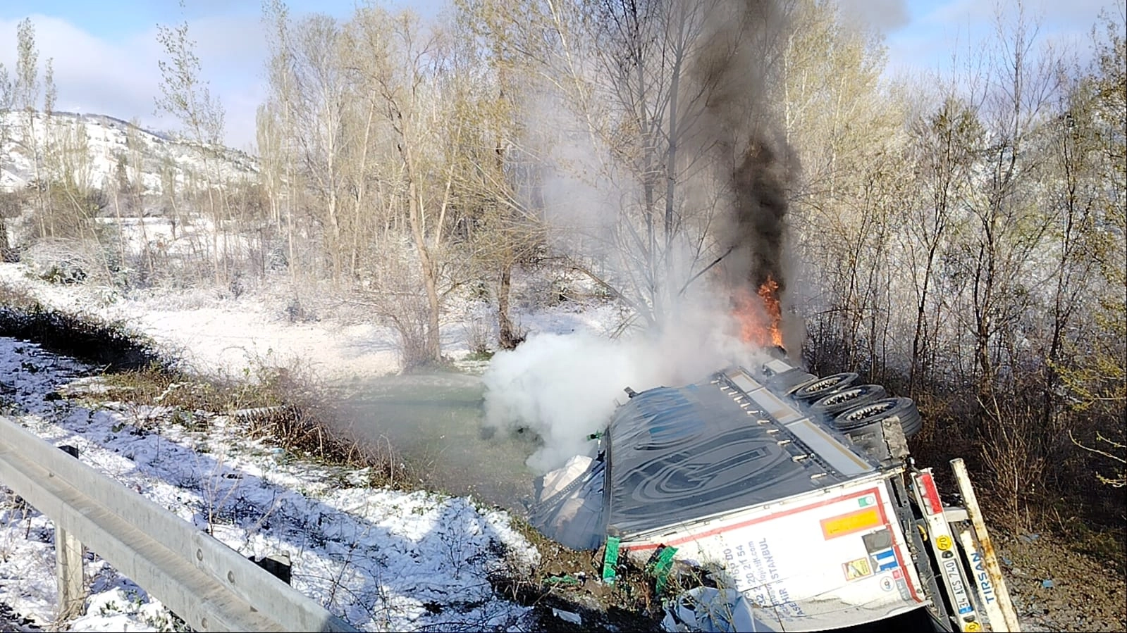 Uğur YİĞİT/SİVAS, (DHA)- SİVAS'ta yol kenarına devrilip alev alan TIR'ın şoförü Muhammed Emin Tunç hayatını kaybetti.Kaza, sabah saatlerinde D-100 kara yolu Koyulhisar ilçesi yakınlarında meydana geldi. Muhammed Emin Tunç’un kontrolünü yitirdiği 08 K 7068 plakalı TIR, yolun sağındaki tarlaya devrildi. Kazanın ardından TIR, çekici kısmından alev aldı. Yoldan geçen diğer sürücülerin ihbarı üzerine kaza yerine sağlık, polis, jandarma ve itfaiye ekipleri sevk edildi. Yangın, itfaiye ekipleri tarafından söndürüldü. Sağlık ekiplerinin yaptığı kontrolde, TIR şoförü Muhammed Emin Tunç'un hayatını kaybettiği belirlendi. Şoförün cansız bedeni Koyulhisar Devlet Hastanesi morguna kaldırıldı. Kaza ile ilgili inceleme başlatıldı. (DHA)FOTOĞRFLI