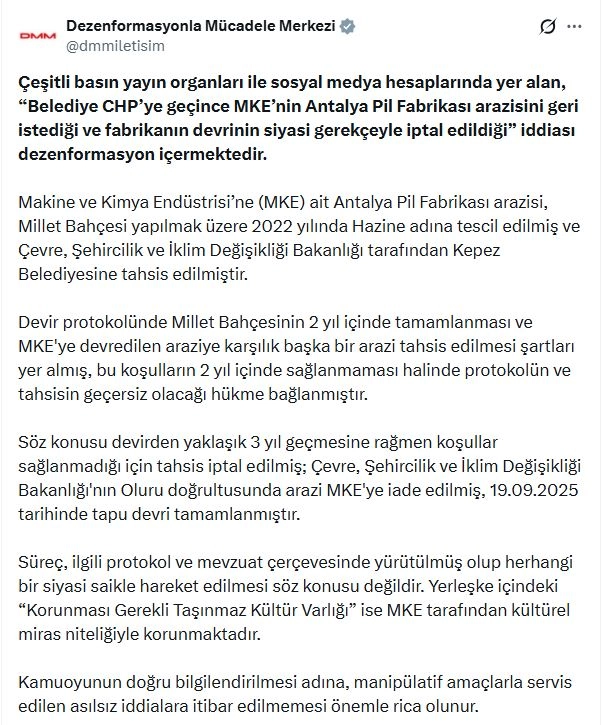 DMM'nin sosyal medya hesabından yapılan açıklamada, "Çeşitli basın yayın organları ile sosyal medya hesaplarında yer alan, 'Belediye CHP'ye geçince MKE'nin Antalya Pil Fabrikası arazisini geri istediği ve fabrikanın devrinin siyasi gerekçeyle iptal edildiği' iddiası dezenformasyon içermektedir. Makine ve Kimya Endüstrisi'ne (MKE) ait Antalya Pil Fabrikası arazisi, Millet Bahçesi yapılmak üzere 2022 yılında hazine adına tescil edilmiş ve Çevre, Şehircilik ve İklim Değişikliği Bakanlığı tarafından Kepez Belediyesine tahsis edilmiştir. Devir protokolünde millet bahçesinin 2 yıl içinde tamamlanması ve MKE'ye devredilen araziye karşılık başka bir arazi tahsis edilmesi şartları yer almış, bu koşulların 2 yıl içinde sağlanmaması halinde protokolün ve tahsisin geçersiz olacağı hükme bağlanmıştır. Söz konusu devirden yaklaşık 3 yıl geçmesine rağmen koşullar sağlanmadığı için tahsis iptal edilmiş, Çevre, Şehircilik ve İklim Değişikliği Bakanlığı'nın oluru doğrultusunda arazi MKE'ye iade edilmiş, 19 Eylül 2025 tarihinde tapu devri tamamlanmıştır. Süreç, ilgili protokol ve mevzuat çerçevesinde yürütülmüş olup herhangi bir siyasi saikle hareket edilmesi söz konusu değildir. Yerleşke içindeki 'Korunması Gerekli Taşınmaz Kültür Varlığı' ise MKE tarafından kültürel miras niteliğiyle korunmaktadır. Kamuoyunun doğru bilgilendirilmesi adına, manipülatif amaçlarla servis edilen asılsız iddialara itibar edilmemesi önemle rica olunur" ifadelerine yer verildi. (DHA)
