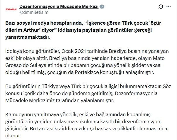 DMM'nin sanal medya hesabından yapılan açıklamada, "Bazı sosyal medya hesaplarında, 'İşkence gören Türk çocuk 'özür dilerim Arthur' diyor' iddiasıyla paylaşılan görüntüler gerçeği yansıtmamaktadır. İddiaya konu görüntüler, Ocak 2021 tarihinde Brezilya basınına yansıyan eski bir olaya aittir. Brezilya basınında yer alan haberlerde, olayın Mato Grosso do Sul eyaletinde bir babanın çocuğuna yönelik şiddet vakası olduğu belirtilmiş; çocuğun da Portekizce konuştuğu anlaşılmıştır. Bu görüntülerin Türkiye veya Türk bir çocukla ilgisi bulunmamaktadır. Söz konusu içerik daha önce de gündeme getirilmiş, Dezenformasyonla Mücadele Merkezimiz tarafından yalanlanmıştır. Kamuoyunu yanıltmaya yönelik, eski ve bağlamından koparılmış görüntülerin yeniden dolaşıma sokulması kasıtlı bir dezenformasyon girişimidir. Bu tarz asılsız iddialara karşı hassas ve dikkatli olunması rica olunur" denildi. (DHA)