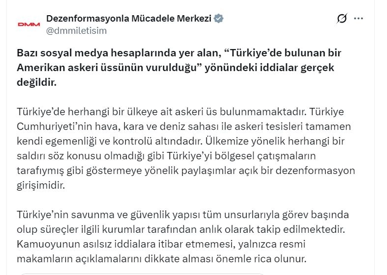 DMM'nin sanal medya hesabından yapılan açıklamada, "Bazı sosyal medya hesaplarında yer alan, 'Türkiye'de bulunan bir Amerikan askeri üssünün vurulduğu' yönündeki iddialar gerçek değildir. Türkiye'de herhangi bir ülkeye ait askeri üs bulunmamaktadır. Türkiye Cumhuriyeti'nin hava, kara ve deniz sahası ile askeri tesisleri tamamen kendi egemenliği ve kontrolü altındadır. Ülkemize yönelik herhangi bir saldırı söz konusu olmadığı gibi Türkiye’yi bölgesel çatışmaların tarafıymış gibi göstermeye yönelik paylaşımlar açık bir dezenformasyon girişimidir. Türkiye'nin savunma ve güvenlik yapısı tüm unsurlarıyla görev başında olup süreçler ilgili kurumlar tarafından anlık olarak takip edilmektedir. Kamuoyunun asılsız iddialara itibar etmemesi, yalnızca resmi makamların açıklamalarını dikkate alması önemle rica olunur" ifadeleri kullanıldı. (DHA)