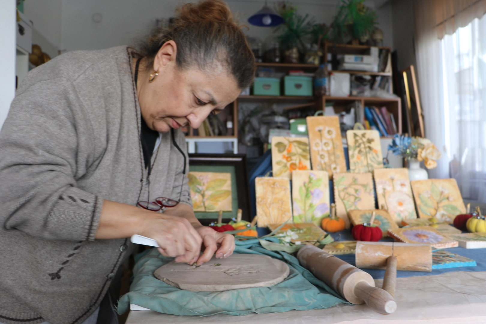 Gökhan İÇKİLLİ/SAMSUN, (DHA)-SAMSUN'da atölyesi bulunan Heykeltıraş Füsun Yalçın, doğadan topladığı çiçek, yaprak ve dalların kalıplarını çıkartarak sanat eserine dönüştürüyor. Yalçın, "Doğadaki atıkları değerlendirmek istedim. Bir de onların kalıcı olmasını istedim. Çünkü doğayı çok seviyorum. Çiçekler solmasın diye onları ölümsüzleştirmek istedim" dedi. İlkadım ilçesinde atölyesi bulunan Heykeltıraş Füsun Yalçın, vitray çalışmalarının yanı sıra plaket tasarımları, heykel ve hediyelik ürünler üretiyor. Yalçın'ın atölyesinde; doğadan toplanan çiçekler, yapraklar, dallar önce çamurla kalıplanıyor ardından alçı döküm yapılarak şekillendiriliyor. Kuruma süreci tamamlandıktan sonra kompozisyonlar oluşturuluyor. Sanatçının imzasını taşıyan eserler arasında Samsun Cumhuriyet Meydanı'ndaki yunus heykelleri, Sinop Adalet Sarayı'ndaki metal adalet heykeli ve Samsun Üniversitesi'ndeki Mimar Sinan büstü yer alıyor. 'SON BİRKAÇ SENEDİR SERAMİK ÇALIŞIYORUM'Birçok kurumlara heykeller yaptığını belirten Füsun Yalçın, "Bir dönem Ondokuz Mayıs Üniversitesi (OMÜ) Güzel Sanatlar Fakültesi'nde hocalık yaptım. Sonra yurt dışına gittim. Amerika'da 8 sene kaldım. 1994 yılında döndükten sonra bir vitray atölyesi kurdum. Atölyede, Samsun'un değişik yerlerine vitraylar yaptım. Ondan sonra işte aslında heykeltıraş olduğum için heykele yönelmek istedim. Son birkaç senedir seramik çalışıyorum. Hem seramik çanak çömlek hem de heykelcikler yaptım. İlk mezun olduğum sene Cumhuriyet Meydanı'ndaki yunusları yaptım. Mimar olan kız kardeşim de havuzunu yaptı. Ondan sonra 40 senenin sonunda yunusları kaldırdılar. Ondan sonra şimdi onu tekrar koydurmaya çalışıyorum. Burada sıkıyönetim komutanlığına kuğu heykelleri yapmıştım. Şimdi Samsun Üniversitesi olan yerde Mimarlık Fakültesi'ne bir Mimar Sinan büstü yaptım. Sinop'ta Adalet Sarayı'nda metal bir adalet heykeli yaptım. Bir de Atatürk portresi yaptım. 3 bin parça, 7'ye 7 milim renkli camları keserek yapmıştım" dedi. '3 BOYUTLU KOMPOZİSYONLAR YAPIYORUM'Füsun Yalçın, "Son zamanlarda da hem heykel çalışıyorum hem de geri dönüşümden bir şeyler yapıyorum. Atık malzemeleri değerlendirmeye çalışıyorum. Bu şeyleri doğadan mevsimine göre topladığım çiçekleri, bitkilerin kalıplarını almaya başladım. Bunlara alçı döküm yapıyorum. Çamurdan kalıp alıyorum ve alçı döküyorum sonra renklendiriyorum. Malzemeyi bulduktan sonra ne yapacağınıza karar verilip, hemen yapılabiliyor. Alçının kuruması biraz zaman alıyor. Ondan sonra renklendirmesi yapıyorsunuz. Fazla zor bir iş değil. Ama çok kalıcı oluyor. Zaten doğayı çok severim. Doğadan malzemeler, tohumlar topluyorum. Onlarla da bir kompozisyonlar yapıyorum. 3 boyutlu kompozisyonlar. Doğadaki atıkları değerlendirmek istedim. Bir de onların kalıcı olmasını istedim. Çünkü doğayı çok seviyorum. Çiçekler solmasın diye onları ölümsüzleştirmek istedim. Ağaçların tohumları çok güzel. Bende birçok ağaç tohumu var. Onları yurdumuzun ve yurt dışının değişik yerlerinden topluyorum. Ayrıca doğa fotoğrafçısıyım. Yaptığım gezilerde toparlayıp getiriyorum. 2-3 bin metre yükseklikten topladığım malzemeler var. Onları değerlendirmeye çalışıyorum" diye konuştu. (DHA)