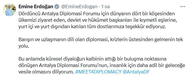 Emine Erdoğan'dan Antalya Diplomasi Forumu'na ilişkin paylaşım