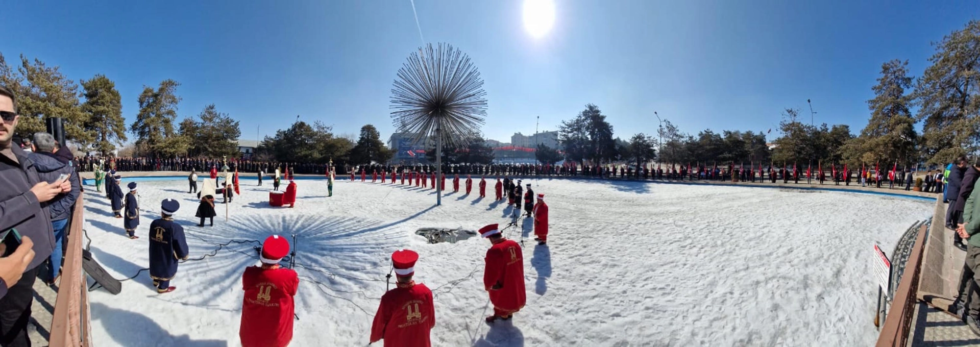 Salih TEKİN/ERZURUM, (DHA)- ERZURUM'un düşman işgalinden kurtuluşunun 107'nci yıl dönümü Atatürk Anıtı önündeki 3 bin 510 metrekare alana sahip havuz başında kutlandı. Erzurum'un düşman işgalinden kurtuluşunun 107'nci yıl dönümü törenlerle kutlandı. İlk tören Yakutiye ilçesindeki Atatürk Anıtı’nın bulunduğu havuz başında yapıldı. Törene, Vali Mustafa Çiftçi, 9'uncu Kolordu ve Garnizon Komutanı Tümgeneral Tuncay Altuğ, Büyükşehir Belediye Başkanı Mehmet Sekmen, askeri ve mülki erkan katıldı. Atatürk Anıtı’na çelenk konulmasıyla başlayan tören, saygı duruşunda bulunulmasının ardından İstiklal Marşı okundu. Günün anlam ve önemini belirten Belediye Başkanı Mehmet Sekmen, "Bugün karanlıklardan aydınlığa çıkıldığı günün 107'nci yıl dönümü. Bugün, Dadaşların şahlandığı ve ordu-millet bütünleşmesinin en iyi örneklerini sergileyerek; zulme, esarete ve yok olmaya karşı koydukları günün yıl dönümü. Yine bugün, vatanımıza göz diken, el uzatan tüm düşmanların, hainlerin ve zalimlerin bu mukaddes beldeden silinip süpürüldüğü günün yıl dönümüdür. 12 Mart, Dadaşlar diyarı, yiğitler ovası Erzurum'un kurtuluş günü olduğu gibi aynı zamanda bu kadim Türk-İslam beldesinin şahlanış günüdür. Hepimize kutlu olsun. 12 Mart, Erzurum için tarihin bin bir facialarını örten bir teselli ve saadet günüdür. 12 Mart aslında sadece Erzurum'un Ermeni çetelerinden kurtuluşu değil, Türkiye'nin emperyalist devletlerin işgallerinden de kurtuluşunun müjdecisidir" diye konuştu. Öğrenciler tarafından şiirler okunan törende bar ekibi gösteri yaptı. Erzurum Büyükşehir Belediyesi Mehter Takımı, günün anısına kısa bir konser verdi. Havuz başındaki törenin ardından protokol, Karskapı Şehitliği ile polis şehitliğini ziyaret ederek dua etti, mezarlara çiçek bıraktı. (DHA)