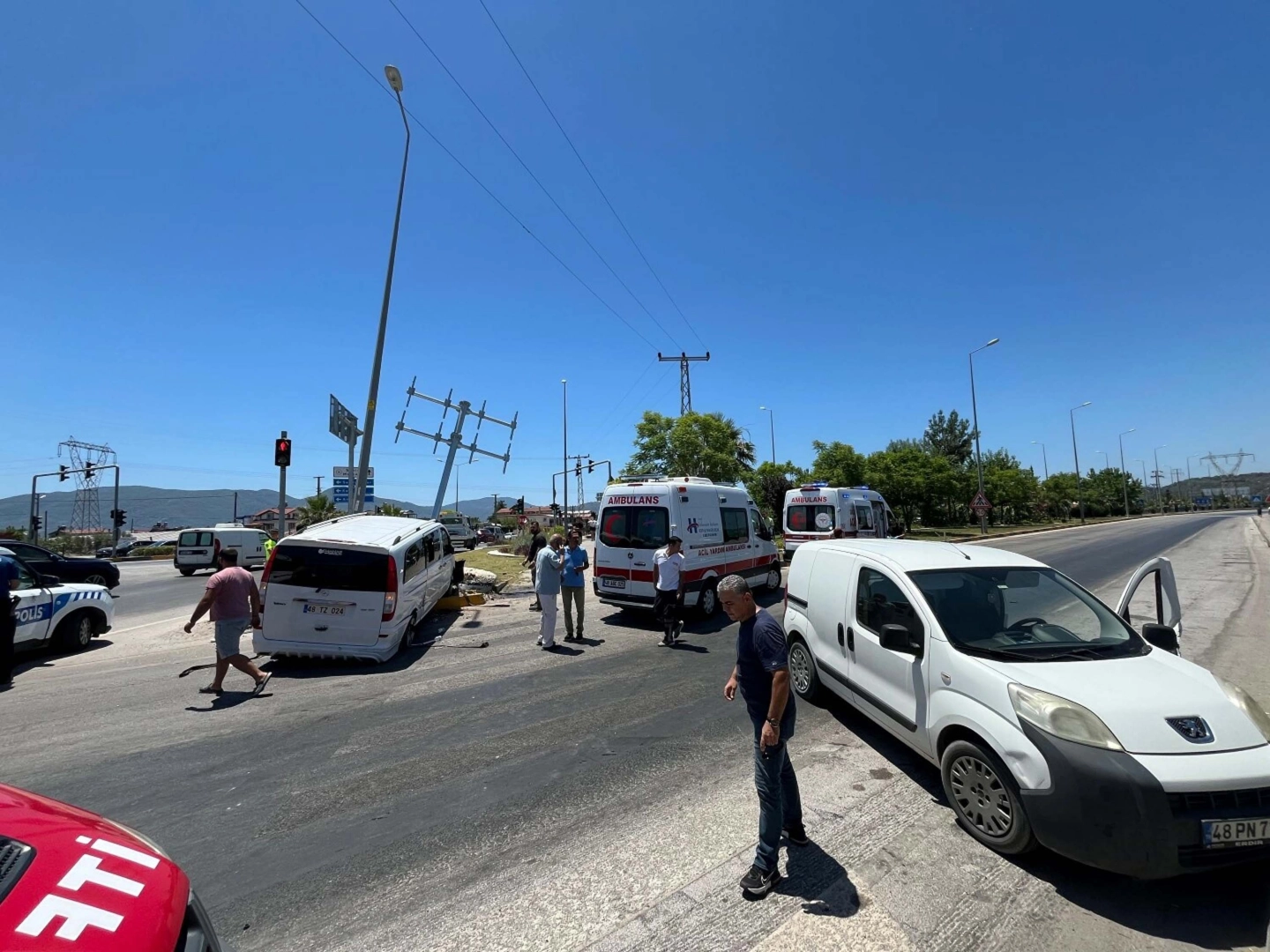 Gülgün AKYOKUŞ/FETHİYE (Muğla), (DHA)- MUĞLA'nın Fethiye ilçesinde minibüs ve hafif ticari aracın çarpıştığı kazada 12 kişi yaralandı.Kaza, Fethiye ilçesi Antalya-Muğla kara yolu üzerindeki Osman Kaya Bulvarı Çatalarık Kavşağı'nda meydana geldi. Turgut A.'nın kullandığı 48TZ plakalı minibüs ile aynı istikamette giden Meryem İ.'nin yönetimindeki 48 PN 770 plakalı hafif ticari araç ile kavşakta çarpıştı. Çarpışmanın şiddetiyle minibüs kavşaktaki yönlendirme direğine çarptı. Kazada, sürücülerle birlikte toplam 12 kişi yaralandı. İhbar üzerine olay yerine sağlık ve itfaiye ekibi sevk edildi. Yaralılar, sağlık ekibinin müdahalesinin ardından çevredeki hastanelere kaldırıldı. Yaralıların tedavisinin sürdüğü öğrenildi. (DHA)
