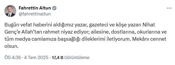 Umutcan ÖREN/ANKARA, (DHA)- GAZETECİ- yazar Nihat Genç (69), Ankara'da tedavi gördüğü hastanede hayatını kaybetti.Gazeteci-yazar Nihat Genç, akciğer kanseri nedeniyle tedavi gördüğü Gazi Üniversitesi Hastanesi yoğun bakım servisinde bugün hayatını kaybetti. İletişim Başkanı Fahrettin Altun, Genç'in vefatı nedeniyle taziye mesajı yayımladı. Altun, "Bugün vefat haberini aldığımız yazar, gazeteci ve köşe yazarı Nihat Genç’e Allah’tan rahmet niyaz ediyor; ailesine, dostlarına, okurlarına ve tüm medya camiamıza başsağlığı dileklerimi iletiyorum. Mekanı cennet olsun" dedi.Ankara Büyükşehir Belediye Başkanı Mansur Yavaş da mesajında, "Gazeteci-yazar Nihat Genç’in vefatını derin bir üzüntüyle öğrendim. Ömrünü doğru bildiği yoldan şaşmadan, memleketin derdini dert edinerek geçirdi. Sözü sertti ama yüreği bu ülkenin insanıyla doluydu. Cesareti, kalemi ve inancı hep hatırlanacak. Kendisine Allah’tan rahmet, ailesine ve sevenlerine başsağlığı diliyorum" ifadelerini kullandı.ÖZGEÇMİŞİ1956 yılında Trabzon’un Faroz semtinde doğan Nihat Genç, ilkokulu İskenderpaşa’da, liseyi Trabzon Ticaret Lisesi’nde tamamladı. Üniversite eğitimine İstanbul ve Ankara’daki iktisadi akademilerde başlasa da siyasi atmosfer nedeniyle ayrıldı. Genç, 1983’te Hacettepe Üniversitesi Sağlık İdaresi Yüksekokulu’ndan mezun oldu. 9 yıl boyunca Sağlık ve Kültür Bakanlıklarında memurluk yapan Genç, medya kariyerine mizah ve siyasi dergilerde teknik personel olarak başladı. Leman, Bağımsız, Kırmızı-Beyaz gibi dergilerde yazıları yayımlandı. 1989’da 'Çete' dergisini kurdu. 2000’li yıllarda Sky Türk’te 'Ne Var Ne Yok', Avrasya TV’de 'Veryansın', Halk TV ve Ulusal Kanal’da çeşitli programlara imza attı. 2019’da Oda TV’den ayrılan Genç, kurduğu Veryansın TV sosyal medya üzerinden program yapıyordu. (DHA)