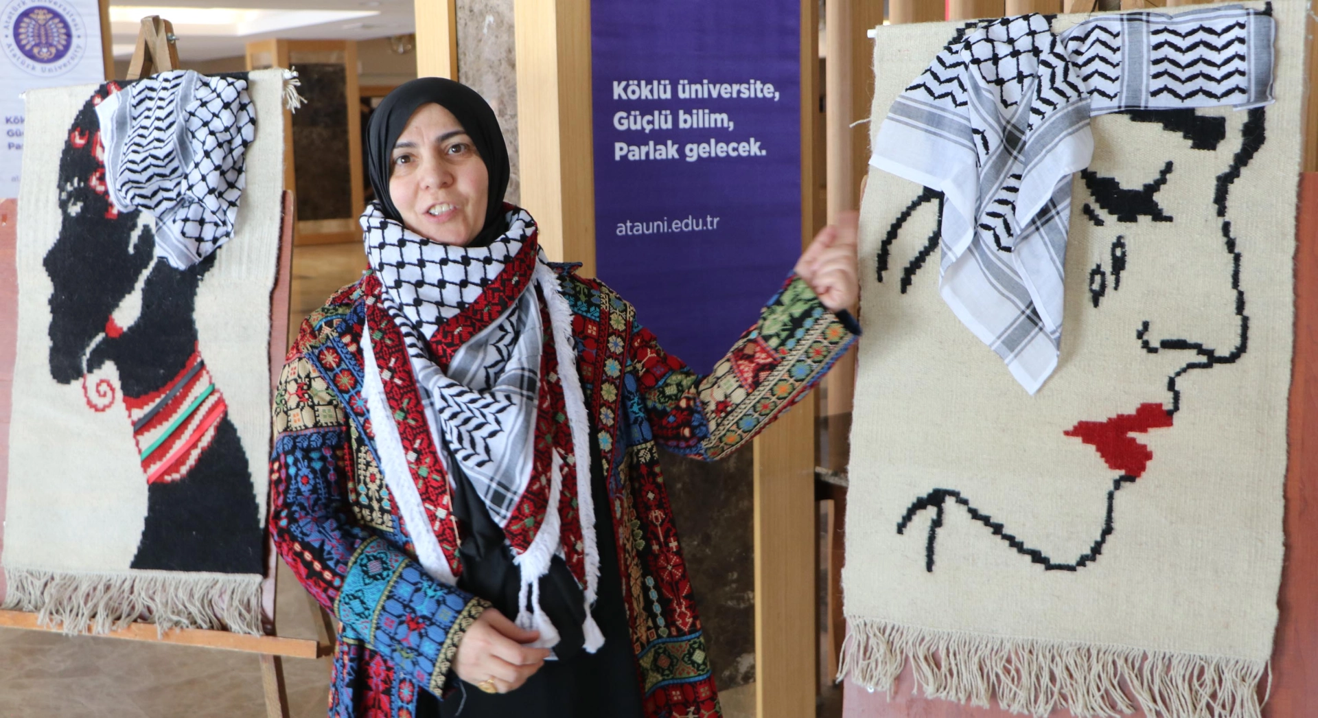 Salih TEKİN/ERZURUM, (DHA)- ERZURUM Atatürk Üniversitesi Güzel Sanatlar Fakültesi (GSF) Geleneksel Türk Sanatlar Bölümü Başkanı Prof. Dr. Ayşe Aslıhan Eroğlu, İsrail'in katliam yaptığı Gazze'deki kadınların sessiz çığlıklarını kilim üzerine ilmek ilmek işledi. Gazzeli kadınlara destek olan dünyanın dört bir yanındaki kadınlara da dokumalarında yer veren Prof. Dr. Eroğlu, her eserine bir de kefiye yerleştirdi. ‘Sessiz çığlık’ ismini verdiği sergi için Prof. Dr. Eroğlu, "Kilimleri dokurken çok ağladım" dedi.Atatürk Üniversitesi GSF Geleneksel Türk Sanatlar Bölümü Başkanı Prof. Dr. Ayşe Aslıhan Eroğlu, 7 Ekim 2023'ten beri İsrail zulmü altındaki Gazze'de kadınların dik duruşlarından etkilenerek onların sesini duyurabilmek için 7 ay önce sergi açmaya karar verdi. Dokuduğu kilimler üzerine kefiye yerleştiren Prof. Dr. Eroğlu, eserlerinde Gazzeli kadınlara destek veren dünyanın dört bir yanındaki ülkelerde yaşayan kadınlara da yer verdi. Eroğlu, 'sessiz çığlık' ismini verdiği sergisini Atatürk Üniversitesi Kültür Merkezi'nde açtı. Atatürk Üniversitesi Rektörü Prof.Dr. Ahmet Hacımüftüoğlu ve akademisyenler, sergideki eserler hakkında Eroğlu'ndan bilgi aldı. Sergi için Eroğlu'na teşekkür eden Rektör Hacımüftüoğlu, bu tür çalışmaların destekleneceğini söyledi.Prof. Dr. Eroğlu, "Eserlerimde Filistinli kadınların sesi olan dünya ülkelerinin kadınlarına da yer verdim. Yaptığım dokumalarda işlediğim çeşitli ülkelerin kadınlarına kefiye giydirerek bir farkındalık oluşturmaya çalıştım. Bu sergiyi Filistinli kadınların sesi olmak arzusuyla hazırladım" diye konuştu.‘HALA SESSİZ, DİRAYETLİ, İMANLI BİR ŞEKİLDE DİK DURUŞLARI VAR’Filistinli kadınların sessiz çığlıkları dirayetleri, imanları, tevekküllerinden etkilendiğini belirten Prof. Dr. Eroğlu, gözyaşlarını tutamadı. Kadınların dramını sanatçı olarak işlediğini anlatan Eroğlu, "Bir kadın olarak çok zor. İnsan kendini onların yerine koyunca çok zor. Eserlerimin hepsini ağlayarak yaptım. Evlatlarını kaybetmiş, çoluğunu çocuğunu kaybetmiş, evini barkını kaybetmiş hala sessiz, dirayetli, imanlı bir şekilde dik duruşları var. Eserlerimi dokurken onlarla empati kurarak yaptım. 7 Ekim'den beri sürekli takip ediyorum. Ne yapabilirim diye düşündüğümde ben de bir sanatçı olarak farkındalık oluşturmak istedim. Yaparken hem ağladım hem empati kurdum" dedi.Sergiyi gezerken çok duygulandığını ifade eden Fatma Topçu da "Sergi bizleri çok duygulandırdı. Hocamızı çok tebrik ediyorum. Filistin'de savaşın mağduru kadınların sesini en azından bu şekilde duyurmaya, yanlarında olduğumuzu göstermeye çalışmak çok güzel bir duygu" dedi. (DHA)