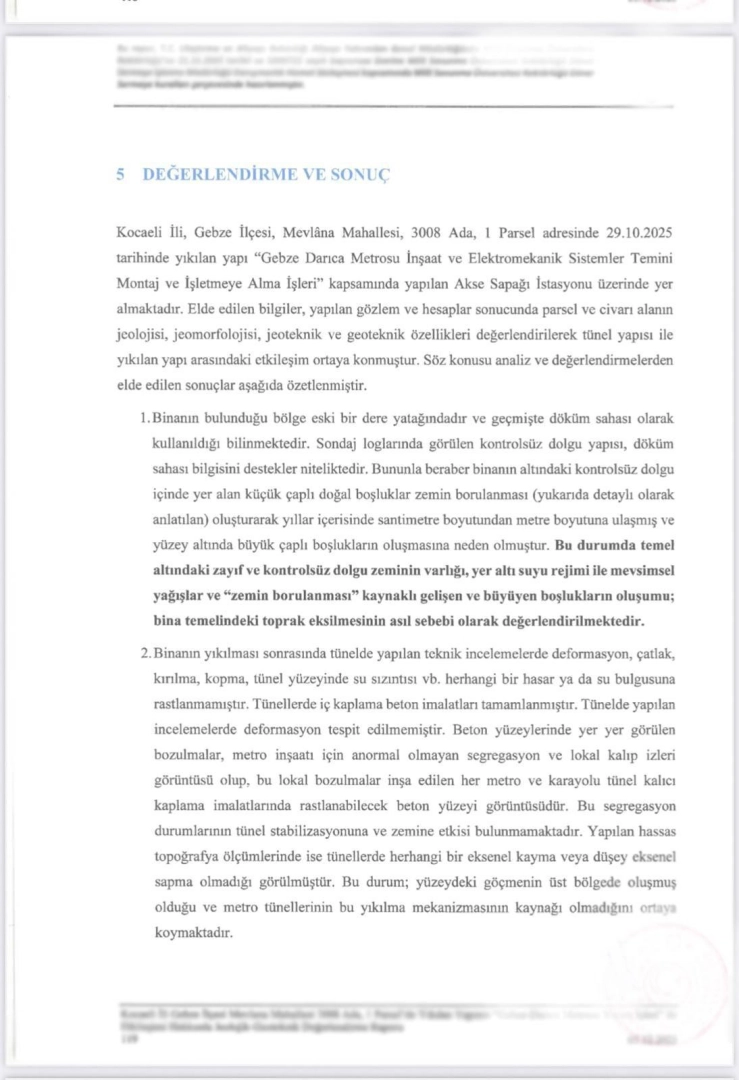 Raporun devamında, metro proje başlangıcından bu yana oluşan tüm zemin hareketinin azami 5 cm olarak ölçüldüğü, bu değerin bina altında oluşan 7 metrelik derin çukura sebep olamayacağına yer verilirken, yapılan teknik değerlendirmeler sonucunda; binanın yıkılmasında, binanın oturduğu zemin ile yüzey ve yüzey altı suyu koşullarının etkili olduğu değerlendirildiği, bina göçmesi ile metro inşaatı arasında direkt bir bağlantı ilişkisi kurulamadığı görüş ve kanaatine varıldığına yer verildi. (DHA)