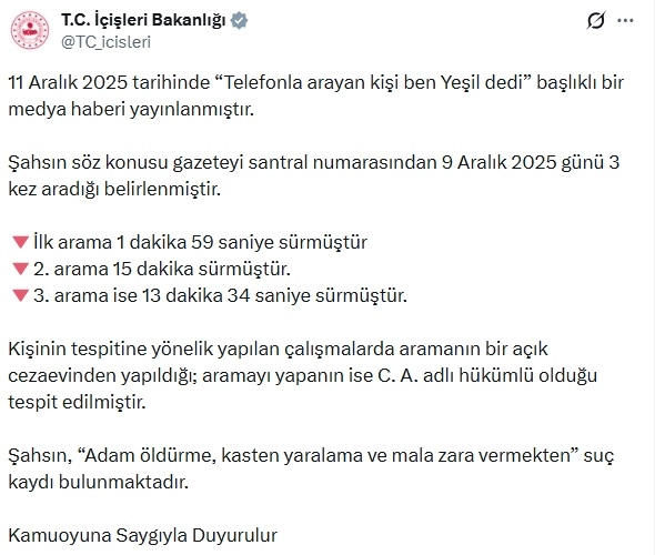 Bakanlıktan yapılan yazılı açıklamada, "11 Aralık 2025 tarihinde 'Telefonla arayan kişi ben Yeşil dedi' başlıklı bir medya haberi yayınlanmıştır. Şahsın söz konusu gazeteyi santral numarasından 9 Aralık 2025 günü 3 kez aradığı belirlenmiştir. İlk arama 1 dakika 59 saniye sürmüştür. 2'nci arama 15 dakika sürmüştür. 3'üncü arama ise 13 dakika 34 saniye sürmüştür. Kişinin tespitine yönelik yapılan çalışmalarda aramanın bir açık cezaevinden yapıldığı; aramayı yapanın ise C.A. adlı hükümlü olduğu tespit edilmiştir. Şahsın, 'Adam öldürme, kasten yaralama ve mala zara vermekten' suç kaydı bulunmaktadır" denildi. (DHA)